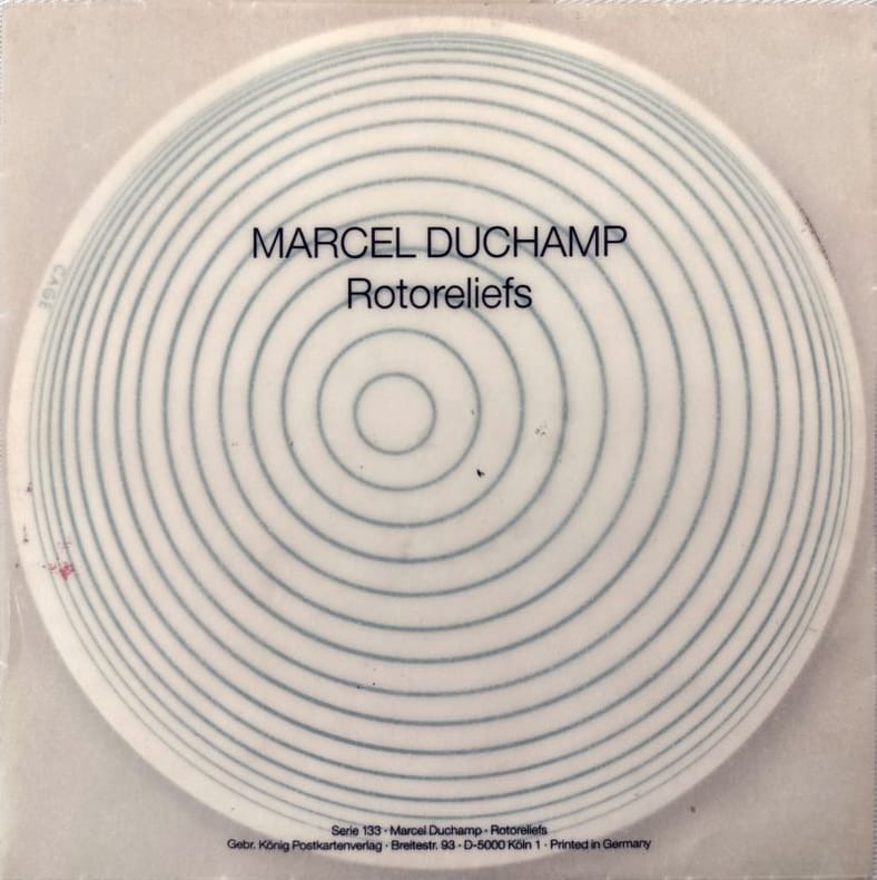 Ensemble de six disques double face avec graphismes en couleur destinés à être regardés sur un plateau tournant entre 40 et 60 tr/min. Avec l'aide de Man Ray, Duchamp a filmé les premières versions des disques tournants dans le court métrage « Anemic Cinema ». Plus tard en 1935, Marcel Duchamp produisit une série limitée de 500 jeux de ces disques destinés à être vendus au Salon des inventeurs du Concours Lépine, mais avec peu de succès. (105576)Schwarz 441 pour la première édition+ Donati 1953 ; Broken Music p.126 Neuf
