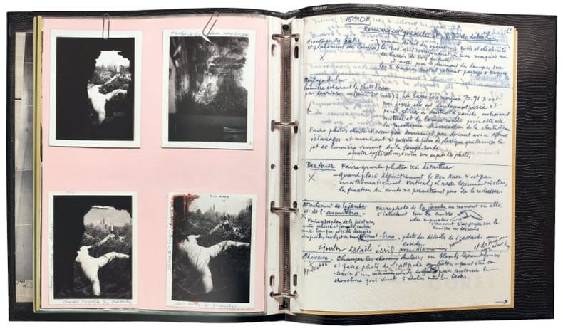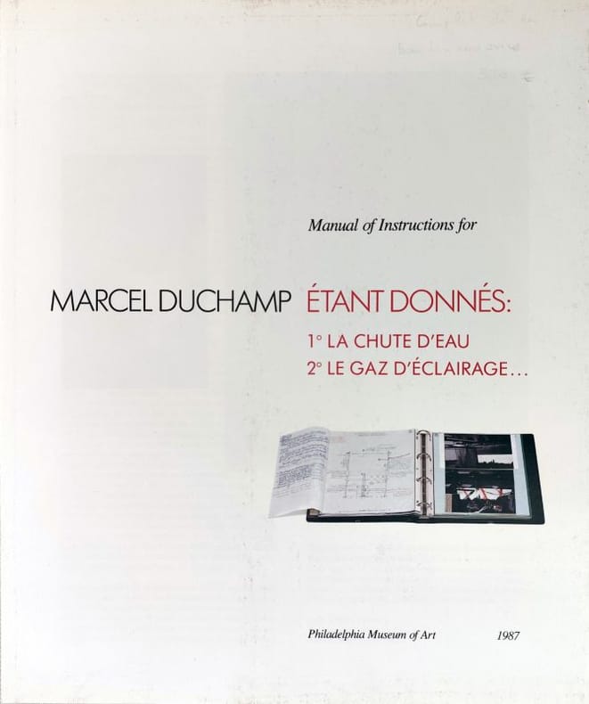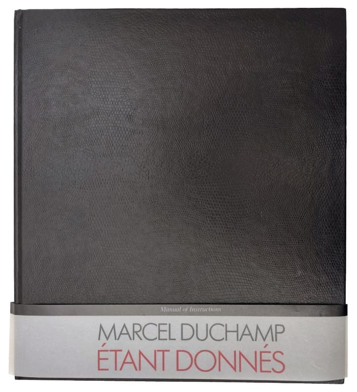 Philadelphie, Philadelphia Museum of Art, 1987, 305x272mm, 56 pages dont plusieurs dépliantes, reliure plein similicuir noir, fac-similé minutieusement reproduit du classeur à trois anneaux rédigé par Marcel Duchamp en vue de la réalisation au musée de Philadelphie de son installation « Étant donnés: 1°La chute d’eau 2°Le gaz d’éclairage»Complet de la double feuille de présentation avec le texte d’Anne d’Harnoncourt et de la bande-annonce imprimée sur papier calque.