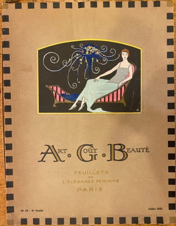 Albert Godde, Beddin et Cie, établissements prestigieux de soieries lyonnais fondé en 1867 publient à partir de 1920 la prestigieuse revue de mode "Art Goût Beauté" ; cette revue paraît pendant 13 ans, présentant les créations des grands couturiers, modistes, accessoiristes, maisons de lingeries et frivolités, ainsi que les échantillons de leurs tissus imprimés... sur des textes journalistiques de Éric Bagge, Odette Marjorie, Lucie Neumeyer ... largement illustrés de pochoirs, souvent contrecollés, et complétés par la présentation des échantillons de tissus A.G.B. en pages de garde. "Revue publiant mensuellement les plus beaux modèles des grands couturiers dans le coloris exact de leur création ainsi que tous les tissus en vogue" qui paraît entre le 10 et 15 de chaque mois. Ce magazine s'appela, à ses débuts et jusqu'en 1921, "Les Succès Art Goût Bon Ton" puis son titre changea définitivement et devint " Art, Goût, Beauté". Ces deux titres sont un rappel des initiales des Successeurs d'Albert Godde, Bedin & Cie. Chaque numéro, d'abord composé de 6 feuillets doubles, passa ensuite à 8 feuillets doubles. Les nombreuses illustrations internes sont collées ou imprimées lithographiquement, en noir ou en couleurs et coloriées au pochoir : Brard, Colette, Dody, Drivon, Guillien, Valentin... La technique graphique rappelle celle de la Gazette du Bon Ton, les textes et les illustrations font partie de la même construction, les aplats de couleurs sont caractéristiques du cubisme et le respect des couleurs des modèles originaux est garanti par la méthode manuelle du pochoir. Les pages de gardes sont composées des tissus lancés par la maison A.G.B. De grands couturiers participèrent à cette élégante revue : Drecoll-Beer, Jenny, Jeanne Lanvin, Joseph Paquin, Jean Patou, Maggy Rouff, Worth, Madeleine Vionnet... Bel exemplaire, infimes usures. Est joint à ce numéro la liste des Maisons accordant un escompte aux abonnés de la revue.