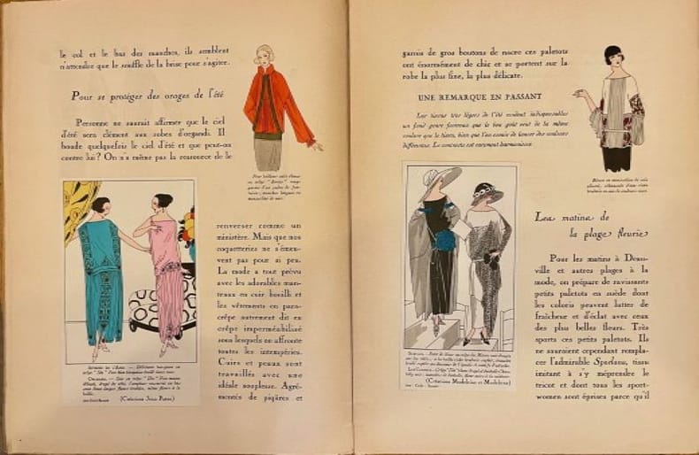Albert Godde, Beddin et Cie, établissements prestigieux de soieries lyonnais fondé en 1867 publient à partir de 1920 la prestigieuse revue de mode "Art Goût Beauté" ; cette revue paraît pendant 13 ans, présentant les créations des grands couturiers, modistes, accessoiristes, maisons de lingeries et frivolités, ainsi que les échantillons de leurs tissus imprimés... sur des textes journalistiques de Éric Bagge, Lucie Neumeyer ... largement illustrés de pochoirs, souvent contrecollés, et complétés par la présentation des échantillons de tissus A.G.B. en pages de garde. "Revue publiant mensuellement les plus beaux modèles des grands couturiers dans le coloris exact de leur création ainsi que tous les tissus en vogue" qui paraît entre le 10 et 15 de chaque mois. Ce magazine s'appela, à ses débuts et jusqu'en 1921, "Les Succès Art Goût Bon Ton" puis son titre changea définitivement et devint " Art, Goût, Beauté". Ces deux titres sont un rappel des initiales des Successeurs d'Albert Godde, Bedin & Cie. Chaque numéro, d'abord composé de 6 feuillets doubles, passa ensuite à 8 feuillets doubles. Les nombreuses illustrations internes sont collées ou imprimées lithographiquement, en noir ou en couleurs et coloriées au pochoir : Colette, Dory, Drivon, ... La technique graphique rappelle celle de la Gazette du Bon Ton, les textes et les illustrations font partie de la même construction, les aplats de couleurs sont caractéristiques du cubisme et le respect des couleurs des modèles originaux est garanti par la méthode manuelle du pochoir. Les pages de gardes sont composées des tissus lancés par la maison A.G.B. De grands couturiers participèrent à cette élégante revue : Beer, Doeuillet, Drecoll-Beer, Jenny, Jeanne Lanvin, Lucien Lelong, Jean Patou, Paul Poiret, Worth, ... Bel exemplaire, infimes usures. Sont joints à ce numéro la liste des Maisons accordant un escompte aux abonnés de la revue ainsi que le bulletin d'abonnement.