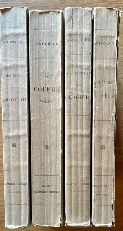 La vierge des glaciers, 415pp., février 1920, non coupé.L'homme de neige, 367pp., janvier 1920, non coupé, couverture détachée avec petits manques.Histoire de Waldemar Daae, 351pp., non coupé.Le coffre volant, 359pp., sans date, non coupé.Défauts minimes. Assez bon