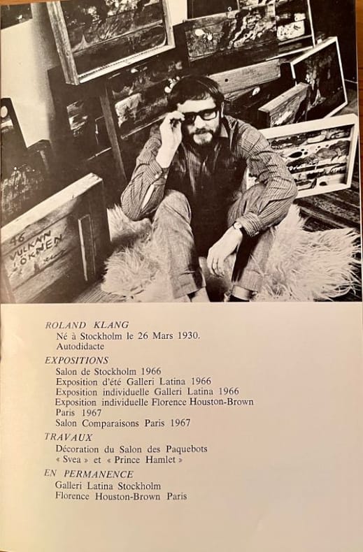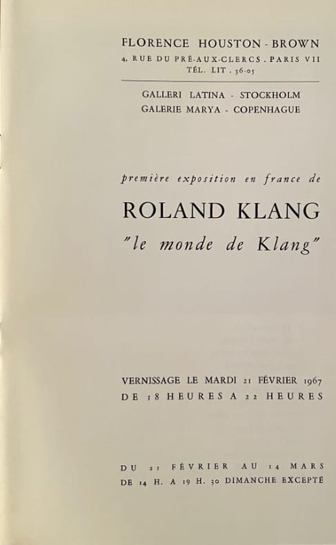Paris, Galerie Florence Houston Brown, 1967, 211x140mm, 8p., agrafé sous couverture cartonnée imprimée.Exposition Roland Klang, du 21 février au 14 mars 1967, en collaboration avec Galleri Latina Stockholm et Galerie Marya Copenhague.