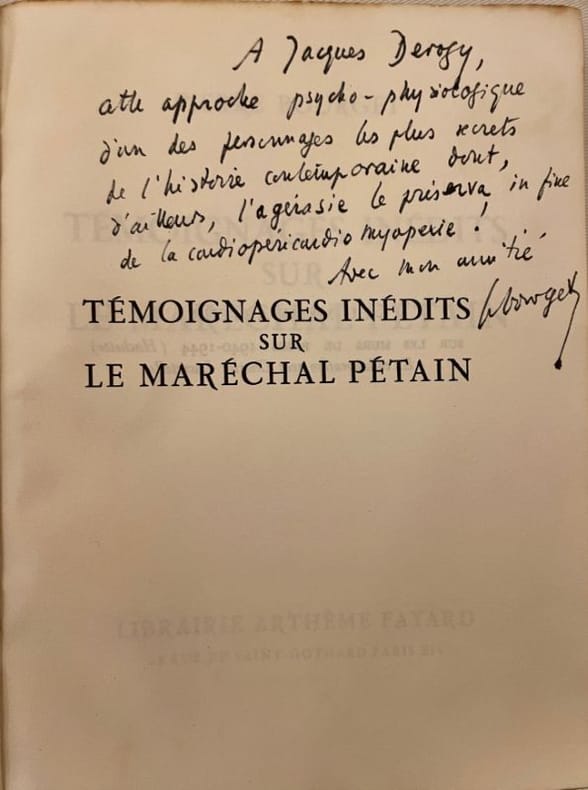 "Témoignages recueilles auprès de Madame Pétain, du commandant Alart, ancien chef du Secrétariat général du maréchal, et des quelques personnes qui vécurent auprès de lui à l'Île d'Yeu, et visant à faire connaître l'homme privé. Un sentiment d'admiration naïve anime l'auteur." Envoi autographe signé à Jacques Derogy (1925-1997) journaliste français, pionnier du journalisme d'investigation.Non coupé, légères rouseeurs sur la tranche supérieure Bon