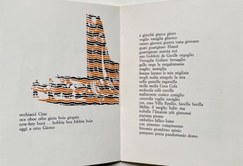 Lecco, Edizioni del'Albero Poeta, 1970, 170x124mm, 24p., broché sous couverture illustrée.Poèmes de François Dufrène et 8 illustrations en couleurs pleine page de Gianni Bertini.Tirage de 1000 exemplaires numérotés. Texte en italien.