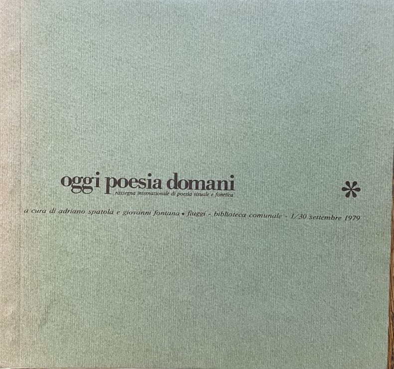 Fiuggi, Biblioteca. Frosinone, E.p.t, 1979. 17 x 16,5 cm, 96 pp. Broché en bon état. Avec des oeuvres de : Adriano Spatola, Vincenzo Accame, Giovanni Anceschi, Nanni Balestrini, Mirella Bentivoglio, Ugo Carrega, Paul de Vree, Giuliano Della Casa, Arrigo Lora Totino, Maurizio Nannucci, Ladislav Novak, Claudio Parmeggiani, Giancarlo Pavanello, Decio Pignatari, Jiri Valoch, Patrizia Vicinelli, Emilio Villa, Eugenio Miccini...
