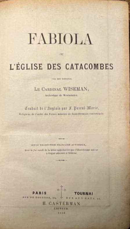volume in- relié, 18x11, demi-cuir, frottements, bon état intérieur, 380pp, tranches dorées. Fac similé de lettre autographe: du Cardinal Wiseman à son éditeur H.Casterman datée de 1856 ( avec cachet postal ) " je vous remercie de la copie que vous avez la complaisance de m'offrir de notre nouvelle édition../.. Non seulement l’exécution typographique de l'ouvrage mérite tous mes éloges, mais la nouvelle traduction qu'il contient ne ../.. guère mieux à désirer. Veuillez agréer l'expression de ma considération, Mons. Casterman " signature quelques illustrations dans le texte, 526pp. Paris, Tournai, Casterman 1859 Ce roman, à la fois historique et hagiographique, nous plonge dans la Rome du IVe siècle après Jésus-Christ. L’auteur dépeint le choc de la rencontre entre une civilisation païenne et le christianisme grandissant. Fabiola est une jeune patricienne cultivée, admirant l’idéal des philosophes épicuriens et stoïciens, mais elle est aussi très orgueilleuse et brutale avec ses esclaves ; elle lit des livres sérieux autant que des romans licencieux. Elle découvre un jour que son ami Sébastien, officier de la garde prétorienne, dont elle admire les qualités dignes des héros antiques, est chrétien. Tout comme l’une de ses esclaves, et pire encore, sa cousine Agnès qu’elle affectionne particulièrement. Incompréhension, inquiétude de Fabiola. Car les chrétiens sont vus comme de stupides adorateurs d’une tête d’âne. Leur nombre croissant inquiète le jeune empereur Maximin Hercule. Tandis que la persécution se déchaîne à nouveau, le cardinal Wiseman, s’inspirant des Actes des martyrs, nous montre le cheminement intérieur de Fabiola. Autour d’elle, héros et traîtres s’affrontent. «Qui n’est pas avec moi est contre moi», «qui n’amasse pas avec moi dissipe», nous dit Notre-Seigneur Jésus-Christ dans l’Évangile. C’est tout l’enjeu de ce drame où les acteurs nous montrent le meilleur et le pire de ce que chacun peut devenir. Découvrez l’héroïsme de Sébastien, le rayonnement d’Agnès, le courage de Tarcisius et de Pancrace, au Colisée ou devant les juges, face à la méfiance, la jalousie et la haine de leurs persécuteurs. Le cardinal Wiseman 1802-1865 fut le premier archevêque catholique de Westminster. Il publia Fabiola ou l’Église des catacombe en 1854. Ce fut son unique roman mais il rencontra un franc succès. ref/247