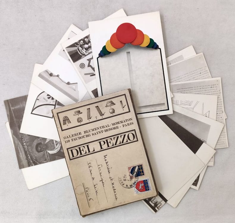 1915 . Boitier de 19 cartes postales 150x104mm représentant des oeuvre de Del Pezoz publié à l'occasion de son exposition à la galerie Blumental-Mommaton 159 Faubourg Saint-Honoré Paris en 1968. Le coffret en carton pporte l'étiquette imprimée de la galerie, les timbres et le cacher de la poste daté de 1968.(105663)