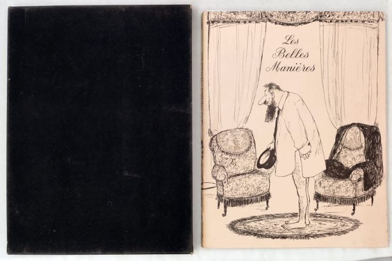 S.L.N.D. Les Amis des Belles Manieres 1960 In-4 235 x 307 mm. Album de 40 dessins reproduits en noir en feuillets libres, sous couverture rose petit accroc au dos, sdans manque et sous etui suedine noire. Tiré à 400 exemplaires numérotés, celui-ci ne portant aucun numéro, entièrement souscrits par les Amis des belles manières.