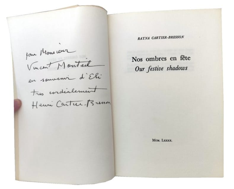 Edition originale bilingue, tirage unique de 270 exemplaires sur Ingres d'Arches comportant un portrait photographique de Ratna Mohini par son mari Henri Cartier-Bresson. Les poèmes apparaissent d'abord en anglais, puis en français, sans qu'il soit précisé en quel langue ils ont été initialement écrits, selon le souhait de l'auteur.Envoi autographe signé d'Henri Cartier-Bresson au Linguiste, ethnologue, humaniste orientaliste Vincent Monteil (1913-2005) :"Pour Monsieur Vincent Monteil en souvenir d'Eli Très cordialement Henri Cartier-Bresson"Eli était le surnom familier de Ratna. Bel exemplaire. (105692) Très bon