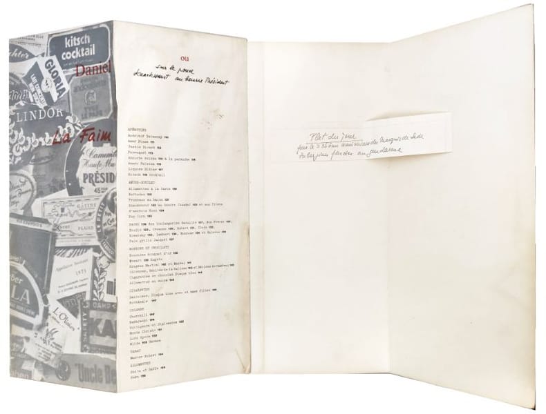A la fin des activités du C.N.A.C., Daniel Spoerri organisa un banquet de 350 personnes.A cette occasion il publia « Notes pour le menu culturel homophone en hommage refusé au sigisbée de la critique par D.S. assisté de Daniel Abadie et Nathalie Menasseyre » qui se trouve dans le premier rabat. Petite trace de sauce au premier rabat .Daniel Spoerri from A to Z, 1991, p. 57 ; "Daniel Spoerri. Attention Oeuvre d'Art". 2008, p. 113.Bonotto FX5123.(103826)