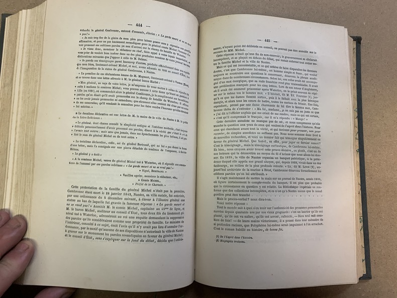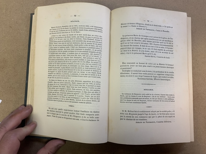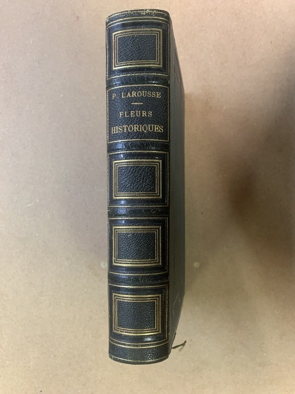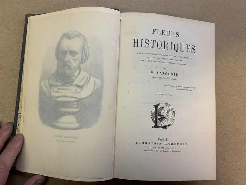 "Clef des allusions aux faits et aux mots célèbres que l’on rencontre fréquemment dans les ouvrages des écrivains français".Fort volume : In 8, reliure demi-chagrin marron à nerfs, titre, caissons, filets dorés. plats percaline. Faux-titre, frontispice sous serpente, titre, XXIV, 696 pages, toutes tranches dorées. 1 photographies de P.A RICHEBOURG, contrecollées sur papier fort, hors-texte, sous serpentes, en tant que frontispice. Paris Larousse et Boyer Libraire éditeur sans date, a regreter des rousseurs éparses legeres, plus concentrées et plus fortes en début et fin de volumes.