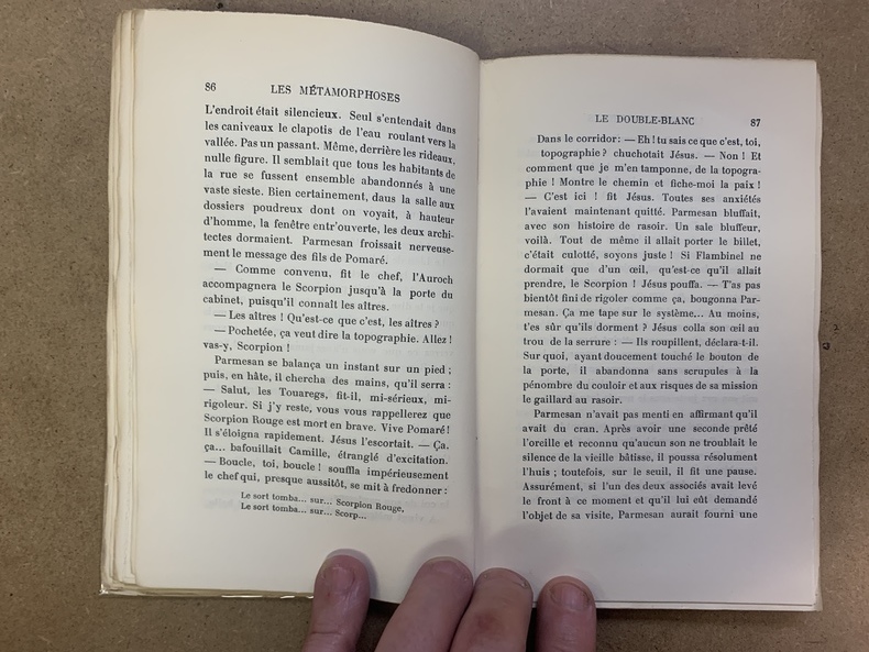 Léonard Gaultier Chez la Veuve Matthieu Guillemot 11 x 17,5 Paris 1616 Trois volumes petits in-8, reliure uniforme demi-vélin fin XIXe, dos lisses ornés de roulettes et de filets dorés, pièces de titre de cuir fauve, titres dorés, plats et gardes marbrés. Premier volume : page de titre absente, [Veuve Guillemot, 1606 ? plutôt que 1614 ?], [14]-frontispice-801[19] pp., 15 gravures en ouverture de chaque livre dont certaines signées du graveur Léonard Gaultier, table in fine. Notre exemplaire est sans page de titre, ni privilège. Il s'ouvre directement sur "L'élégie pour Ovide", du poète originaire de Moulins et ami de Renouard, Jean de Lingendes, contemporain d'Honoré d'Urfé, suivie de vers du poète berruyer Pierre Motin "A Monsieur Renouard sur la traduction des Métamorphoses d'Ovide" et des "Stances sur les métamorphoses d'Ovide traduictes par Monsieur Renouard" signées D. DM, suivies des "Métamorphoses d'Ovide" en quinze livres et d'une table des matières. Deuxième volume : "Le jugement de Paris", Paris, chez la Veuve Matthieu Guillemot, 1616, frontispice gravé sur bois par Léonard Gaultier, dédicace à "Louyse de Lorraine Princesse de Conty" ornée d'une vignette et lettrine, stances de Jean de Lingendes, texte en prose de Nicolas Renouard, suivi des "Remèdes contre l'amour", Paris, chez la Veuve Matthieu Guillemot, 1616, [8]-48 et 30 p. Troisième volume : "XV discours sur les métamorphoses d'Ovide, contenant l'explication morale des fables", Paris, chez la Veuve Matthieu Guillemot, 1625, 314 p., vignettes et lettrines. Bon ensemble sans rousseurs, belles gravures et frontispices de Gaultier, premières pages et gravure du 4ème livre du premier volume habilement restaurées sans manque de texte au verso, petite étiquette en tête du second volume. (EvB73) PHOTOS NUMERIQUES DISPONIBLES PAR EMAIL SUR SIMPLE DEMANDE-DIGITAL PHOTOGRAPS MAY BE AVAILABLE ON REQUEST Livre