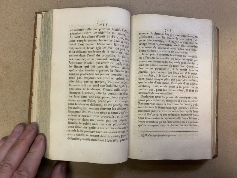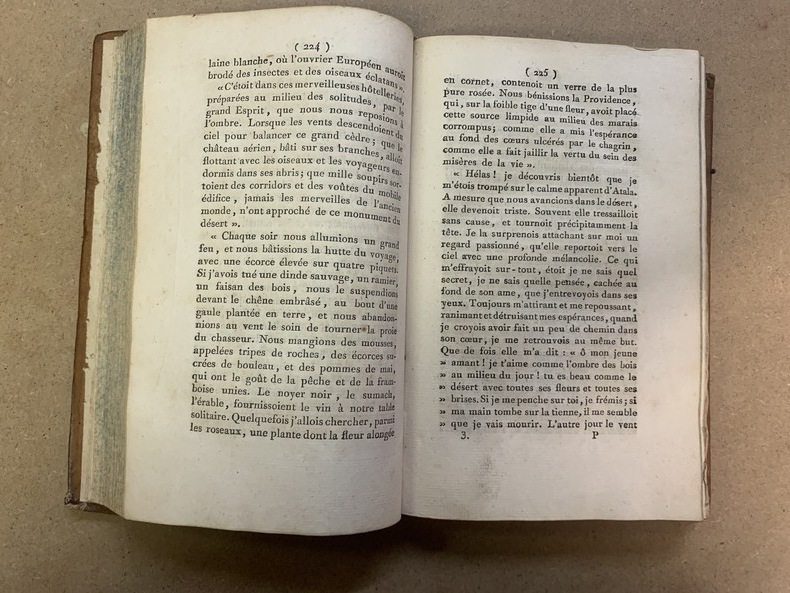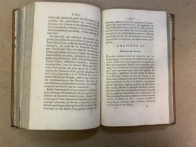 Paris * Chez Migneret, Imprimeur [en réalité, Avignon Chambeau] * An X – 1802 * Reliés, pleine basane fauve marbrée, dos long joliment orné d’attributs doré, pièce titre et de tomaison, vermillon et vert, tranches mouchetées, reliures d’époque, 4 tomes en 2 volumes in-8 (20x13cm) de X (faux-titre, titre, préface)-296 (et non 396) ; 2ff.-342 et 2ff.-304 plus 2ff.-344 pages Edition originale, mais sans le tome V portant le titre « Appendice du Génie du Christianisme ». Plusieurs erreurs de pagination, non décrites par Vicaire II-281, 282, Tome1, nous passons de la page 274 à 279, sans manque et la table des chapitres est numérotée 394 , 395 et 396 pour 294 ; 295 et 296. Très agréables exemplaires en reliure d’époque