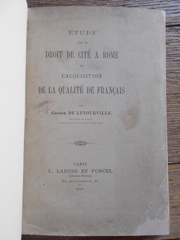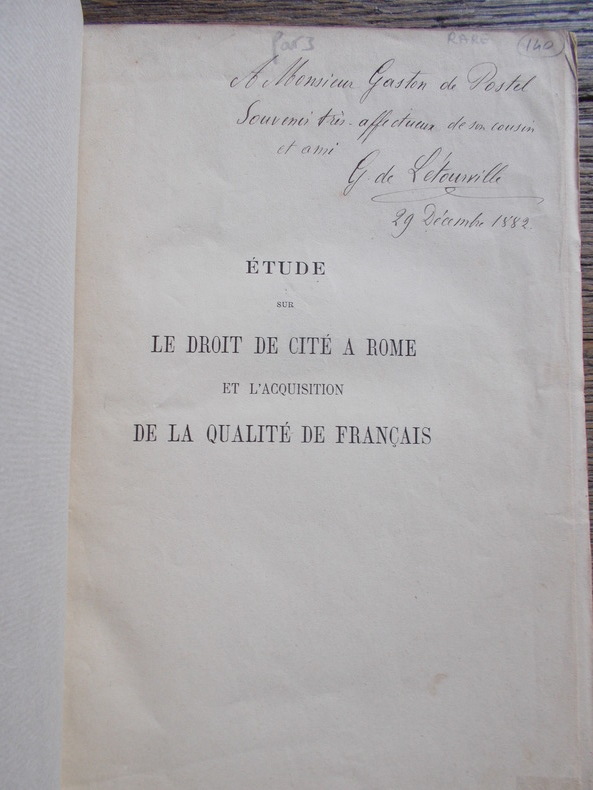 Paris, Larose et Forcel, 1883 Grand in 8 de 228 pages. Reliure amateur toilée, bon état malgré la couverture tachée et restaurée. Pièce de titre en cuir sur le dos et le premier plat. Envoi de l'auteur à son cousin Gaston de Postel . Expédition gratuite par lettre suivie