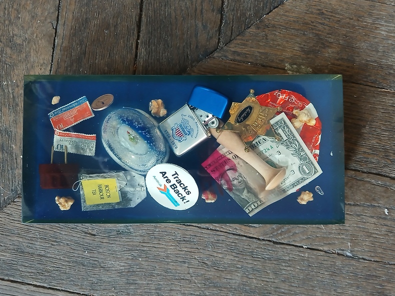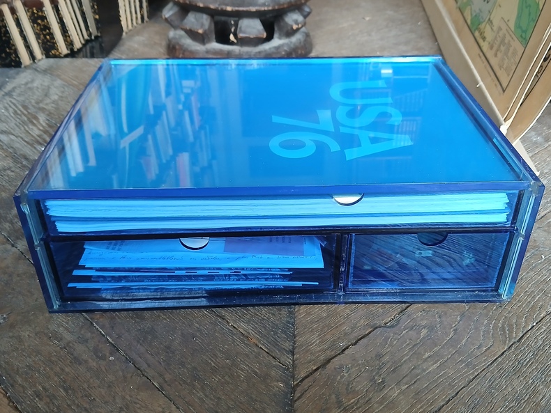 Le Club du Livre. Philippe Lebaud Editeur, 1975. Coffret en plexiglas bleu (41,5 x 31,5 x 12,5 cm) divisé en trois compartiments-tiroirs contenant: - Un ouvrage in-folio en feuilles signé par Michel Butor, 20 sérigraphies originales signées à la mine de plomb par Jacques Monory (38 x 28 cm) -Un bloc de résine contenant des objets représentatifs de la société américaine contemporaine (Billet d' un dollar, étoile de shérif, boîte de soda, prise pour 110 volt, un sachet de thé, deux timbres, du pop-corn, un briquet Zippo, badge, etc.) - Divers objets (un stylo-plume d'oie bleue, un coffret contenant des masques, fac-similés de lettres, un puzzle, une carte géographique, un tiré à part de la revue Critique de mars 1975, texte de Michel Butor sur le Wanted de Marcel Duchamp, etc. Edition originale Tirage limité à 300 exemplaires. Celui-ci portant le n°2/300 Bon état. La carte signée par les auteurs est absente.On joint la facture portant le numéro de tirage. Il semblerait qu'il n'y ait eu que 150 exemplaires fabriqués et sur ceux-ci tous ne possèdent pas les objets coulés dans la résine. Seuls les exemplaires avec le bloc de résine sont considérés comme contemporain de la sortie de ce livre sculpture. 11,5 kgs