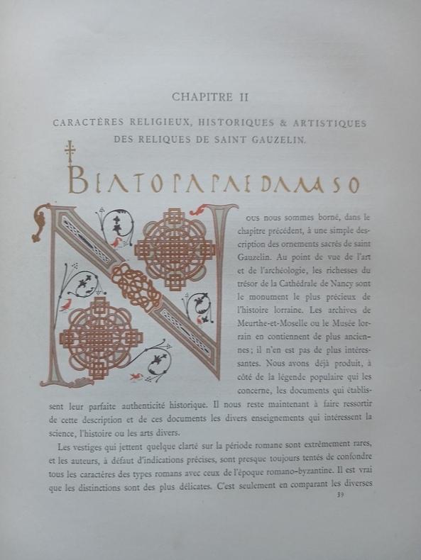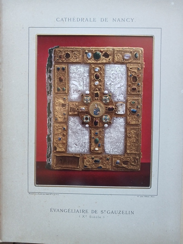 Histoire et description de la primatiale de Nancy depuis sa fondation sous les ducs de Lorraine jusqu'au Concordat, avec de riches détails sur l'époque révolutionnaire, l'architecture des bâtiments, son mobilier, son trésor, contribution à l'histoire artistique de la Renaissance carolingienne. Contient en outre, au sujet de la bague de saint Gauzelin, l'ébauche d'une thèse complète sur les anneaux antérieurs au Xe siècle (10 pp.). Rare avec le frontispice. Petit manque de papier au second plat, petite griffure à un coin, déchirure marginale à 1 f., bel exemplaire. - Frais de port : -France 10,8 € -U.E. 13 € -Monde (z B : 23 €) (z C : 43 €)