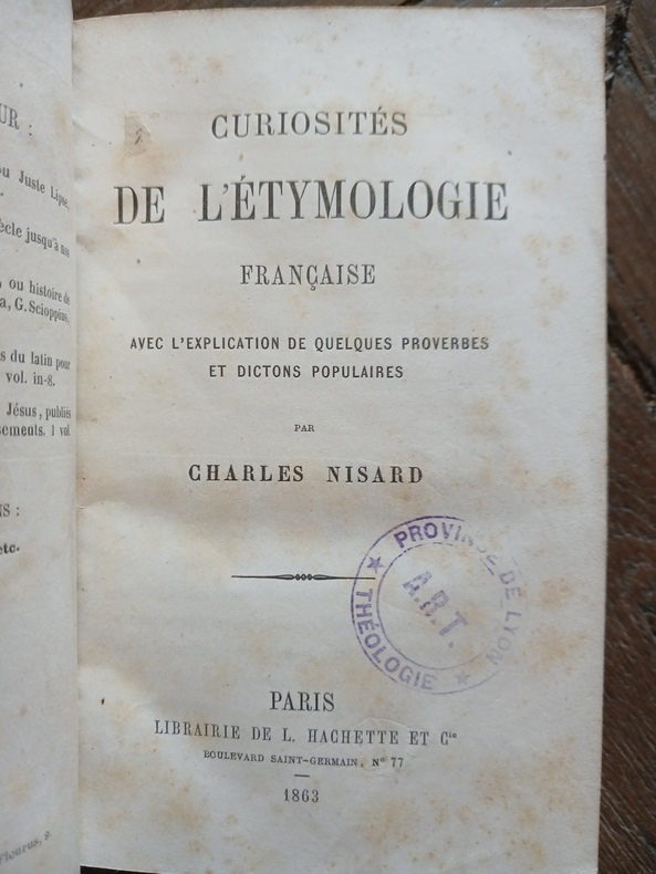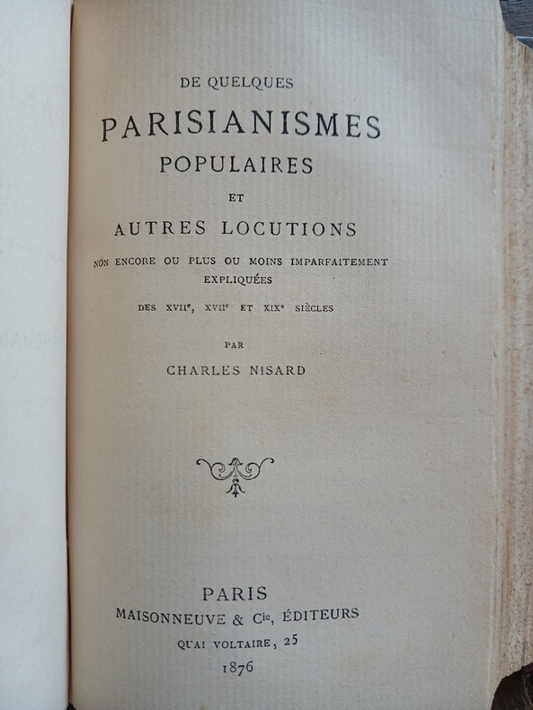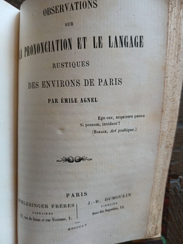 Recueil de 3 ouvrages - Curiosités de l'étymologie française avec l'explication de quelques proverbes et dictons populaires. Paris, Hachette, 1863 51+337 pages -Charles Nisard De quelques parisianismes populaires et autres locutions Paris, Maisonneuve et Cie, 1876 vii+232 pages -Emile Agnel Observations sur la prononciation et le langage rustique des environs de Paris. Paris, Schlesinger, 1855 118 pages 1 volume (18x12cm) Reliure demi chagrin, dos à nerfs. Bon état intérieur, quelques rousseurs. Tampon de congrégation religieuse. Une annotation au bas d'une page. Linguistique, patois