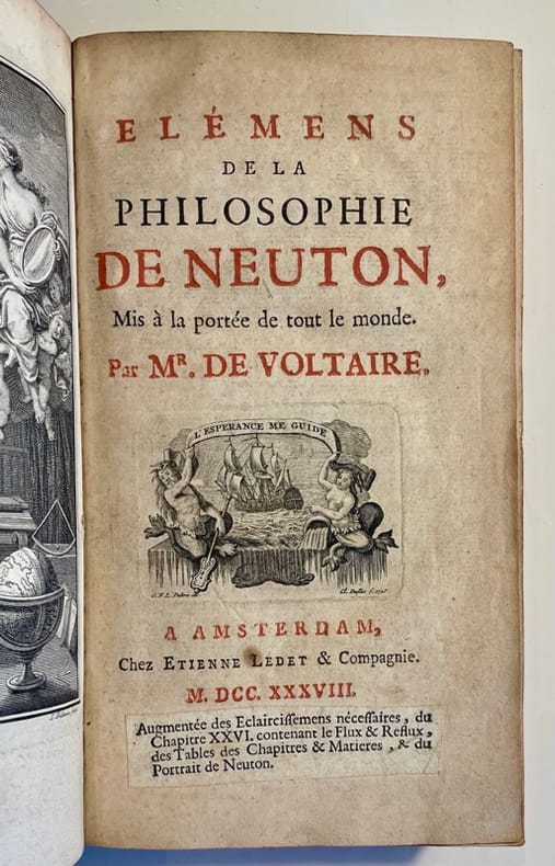 Édition originale. Voltaire commença la composition de son principal ouvrage scientifique pendant l'été de 1736, inspiré par les études mathématiques et scientifiques de la marquise Du Châtelet et l'exemple de Francesco Algarotti. Il propose de convertir les Français au newtonianisme ; rejetant le dialogue, employé par Fontenelle, Algarotti et d'autres, et afin de mettre la science à la portée du public, il adopte un ton sérieux, des illustrations géométriques et des calculs.L'ouvrage parut avant que Voltaire eût envoyé la fin du 23e chapitre et le 24e ; malgré sa réticence, l'éditeur hollandais fit achever cette édition par un mathématicien anonyme et ajouta au titre : mis à la portée de tout le monde. Voltaire fit publier une nouvelle édition à Paris chez Prault, à laquelle il ajouta quelques cartons changeant très peu le texte de l'édition originale.Un frontispice gravé où figure Mme Du Châtelet tenant en main un miroir qui éclaire le visage de Newton ; un portrait de Voltaire gravé par J. Folkema, dessiné par J. Dubourg. 25 culs-de-lampe par Dubourg, Folkema, Konder, Decave, B. Picart et Schley, fleuron de titre gravé par Duflos. 7 figures gravées sur cuivre dont une planche repliée.Très bel exemplaire.Bengesco I, 1570 ; L'Oeuvre imprimé de Voltaire à la B.N., 3744 ; Cohen - De Ricci, 1037.