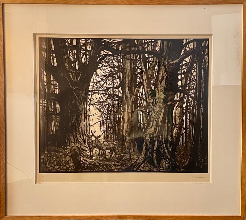 Gravure sur bois en noir (63 x 51 cm). Épreuve d'artiste sur papier vergé, avec amical envoi autographe signé par P. Baudier.Dans cette belle vue de la forêt l'hiver, les contrastes des tonalités sont saisissants et soulignent la puissance des arbres qui abritent les animaux qui s'y cachent.