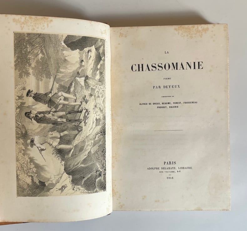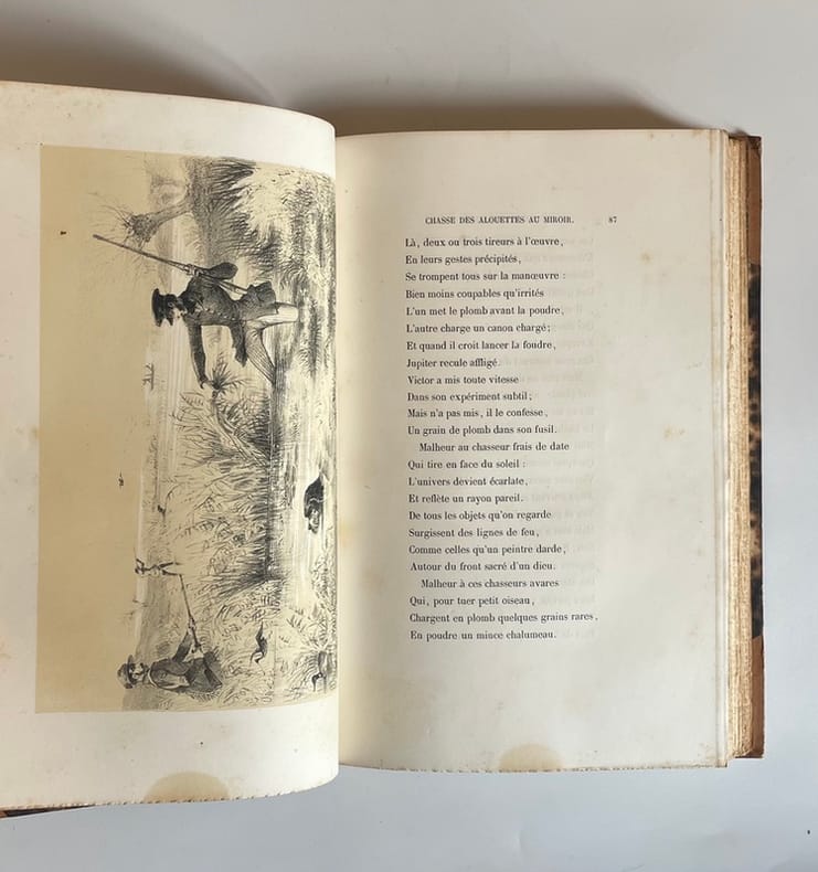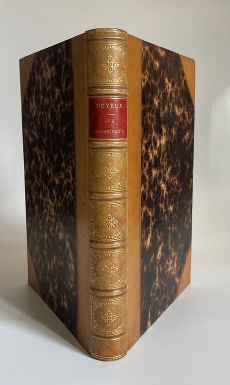 Paris, Delahayes, 1856. In-8, demi-veau fauve à coins, dos à nerfs orné, pièce de titre rouge, non coupé, tête dorée (Rel. légèrement postérieure).À la fois recueil de poèmes sur la chasse et encyclopédie cynégétique, cet ouvrage parut en édition originale en 1844. Delahays remit en vente en 1856 les invendus, textes et planches, avec un titre nouveau et un nombre de planches inégal selon les exemplaires (3, 4, 5 ou 6).Celui-ci comprend 4 planches hors texte en deux teintes.Des rousseurs.