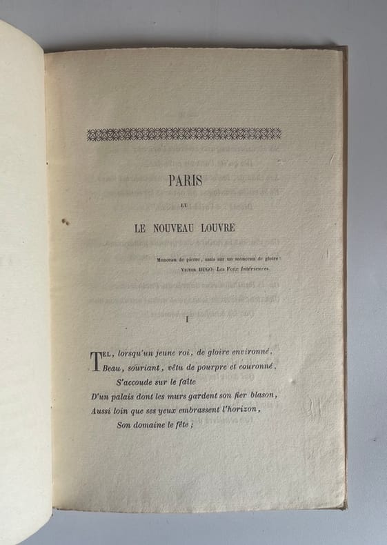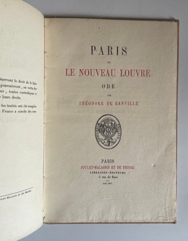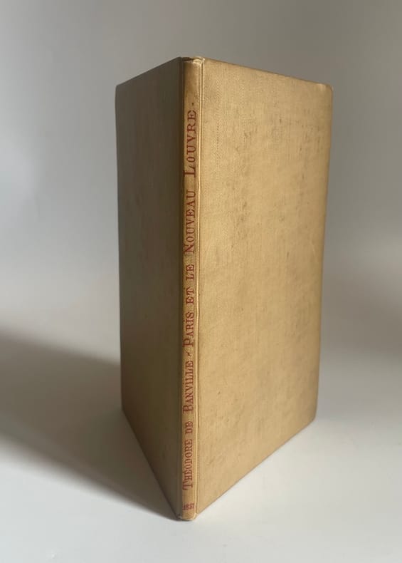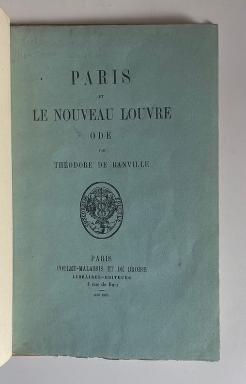 Paris, Poulet-Malassis et de Broise, juin 1857. In-12, 29 pp., (1) f. (marque typographique), bradel percaline beige, couvertures bleues imprimées cons. (Rel. de l'époque).Oberlé, 156.Édition originale de ce long poème composé comme une nouvelle "ode funambulesque".Entièrement imprimée en caractères italiques, elle ne fut tirée qu'à 400 exemplaires sur hollande. Avec un ton faussement solennel, Banville décrit les grands travaux de Napoléon III et de l’architecte Hector Lefuel au Louvre, notamment l’achèvement de la façade et la réunion des Tuileries et du palais du Louvre — vaste entreprise qui durera près d'une décennie (1854-1862).Banville croque sur un ton satirique un monde parisien d’artistes, de critiques, de journalistes et de directeurs de théâtre, dont Louis Véron (1798-1867), dédicataire de l'ouvrage et ancien directeur de l’Opéra de 1831 à 1835. Dans ses Mémoires d’un bourgeois de Paris (1856-1857), l'ancien médecin reconverti en homme d’affaires, raconte sa vie et ses succès avec autocomplaisance. Dans ses Odes funambulesques parues quelques mois auparavant, Banville s'était d'alors amusé à le ridiculiser dans le poème "V... le baigneur".Plaisant exemplaire en cartonnage de l'époque ; il provient de la bibliothèque Paul Chenay (1818-1906), avec son ex-libris "Mihi Tantum" gravé par G. Huot. Graveur et aquafortiste, Paul Chenay était le beau-frère de Victor Hugo.