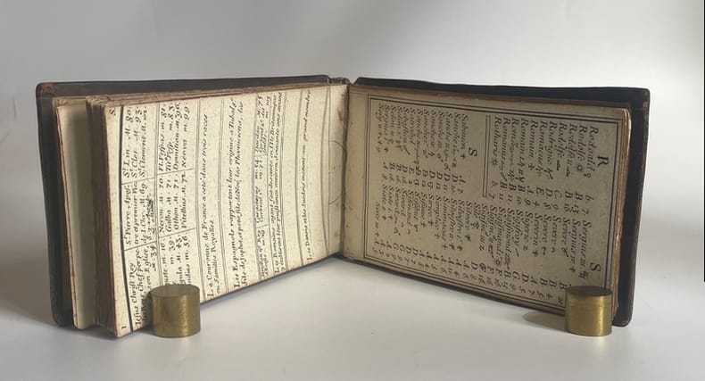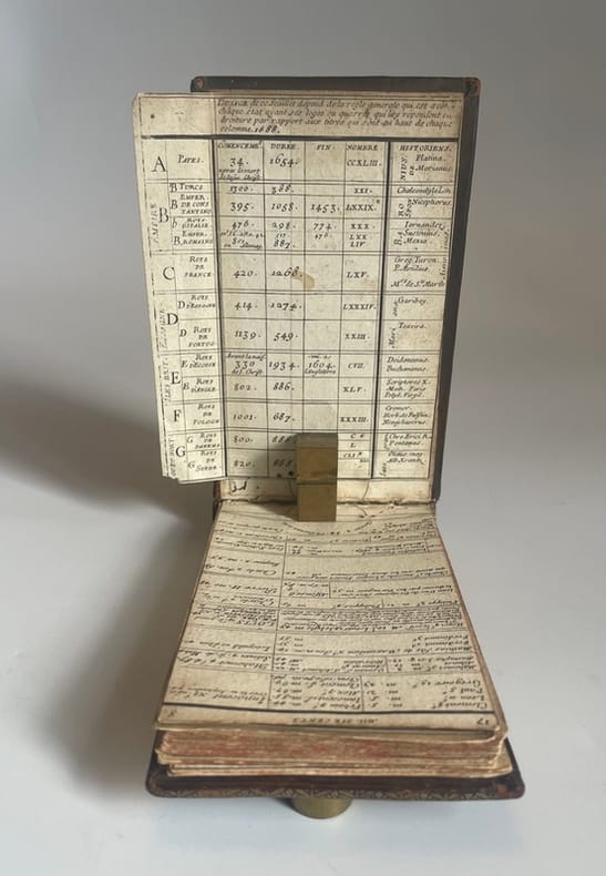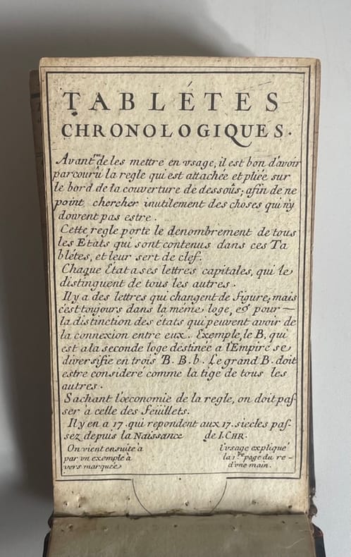 Paris, Denys Thierry, 1688. In-16 oblong, 24 feuillets gravés [dont 19 gravés recto-verso, et 5 gravés d'un seul côté : le titre, une planche illustrée, le dernier feuillet de la table et les 2 feuillets (règle générale et la clef) collés aux contreplats] ; veau moucheté, dos lisse orné (Rel. de l'époque).Charmant manuel historique portatif, entièrement gravé par Senault. Destinées aux élèves, aux enseignants et aux lettrés qui avaient besoin d’un guide de lecture de l’histoire sacrée et profane, ces “tablettes” étaient conçues comme des tableaux synoptiques, sans doute à apprendre par cœur. Elles connurent un vrai succès à la fin du XVII et au début du XVIII siècle.Petit manque au dos, charnières fendues.