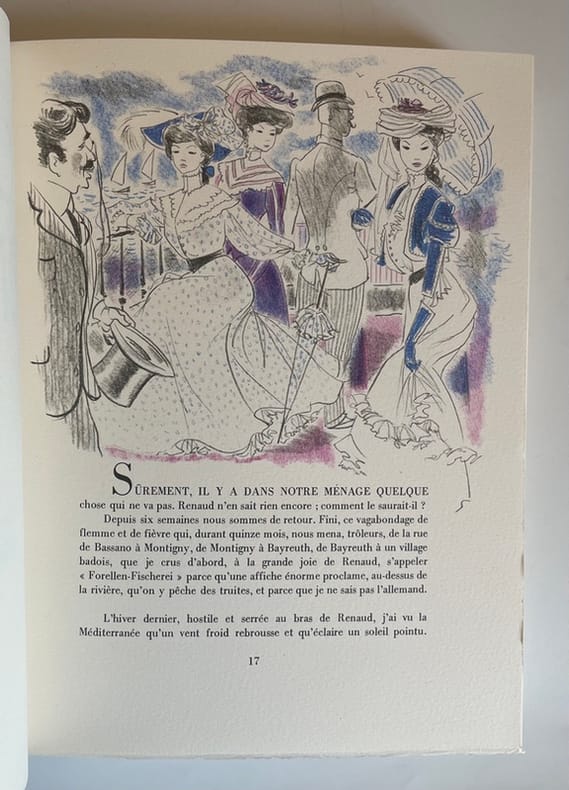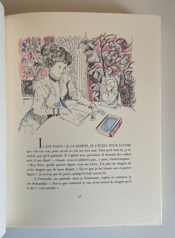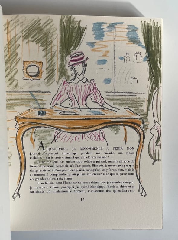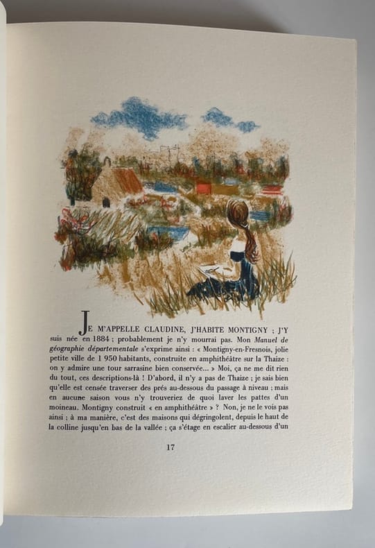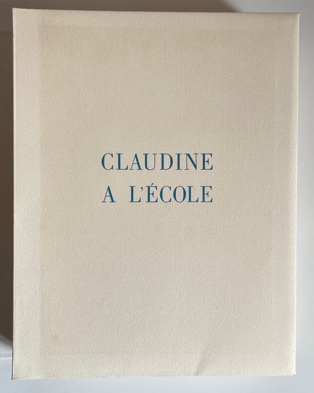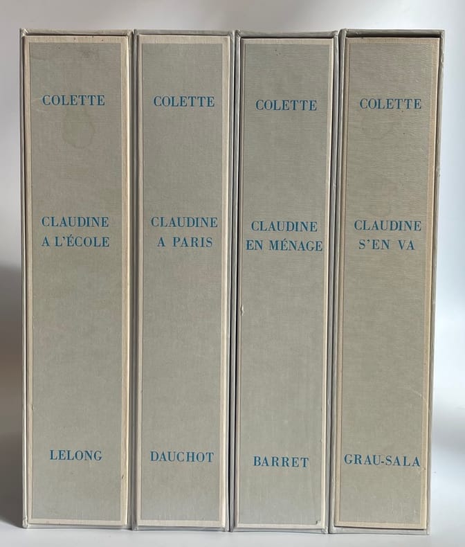 Bièvres, Pierre de Tartas, 1972-1973. 4 vol. in-4, brochés, chemises et étuis éditeur.Édition illustrée de lithographies en couleurs hors-texte par divers artistes ; elle comprend un frontispice de Jean Cocteau ; 18 planches dont 4 refusées de Pierre Lelong pour Claudine à l'école ; 24 planches de G. Barret pour Claudine en ménage ; 24 planches de G. Dauchot pour Claudine à Paris ; 21 planches et 4 refusées de Grau Sala pour Claudine s'en va.Tirage à 1047 exemplaires. Un des 200 sur vélin, n° 118, contenant une suite des hors-texte en couleurs sur vélin.
