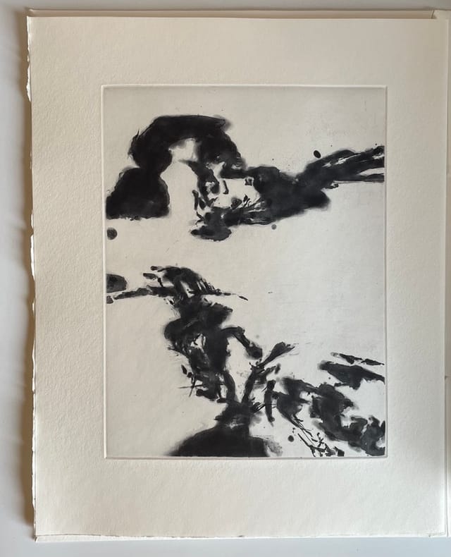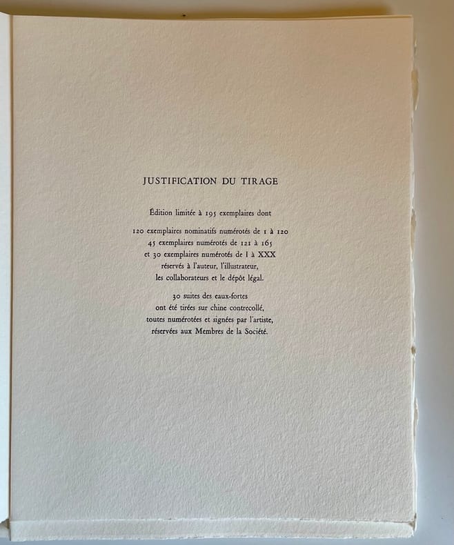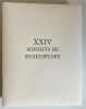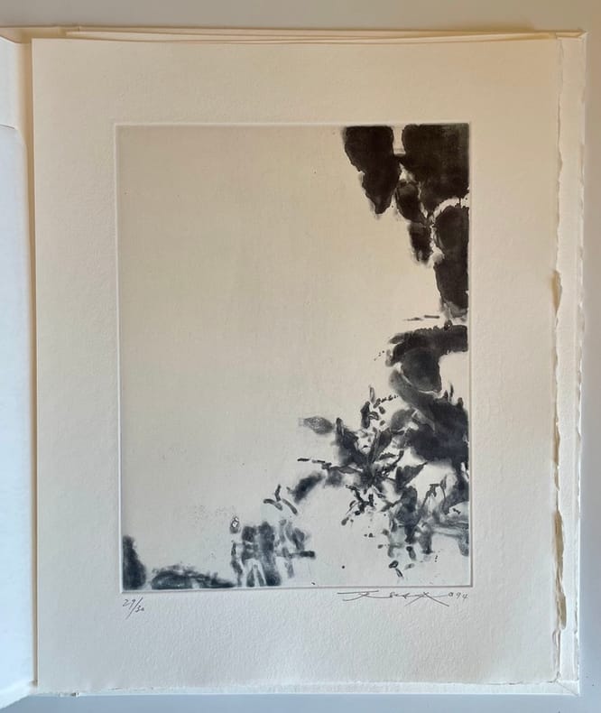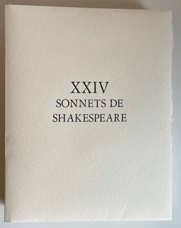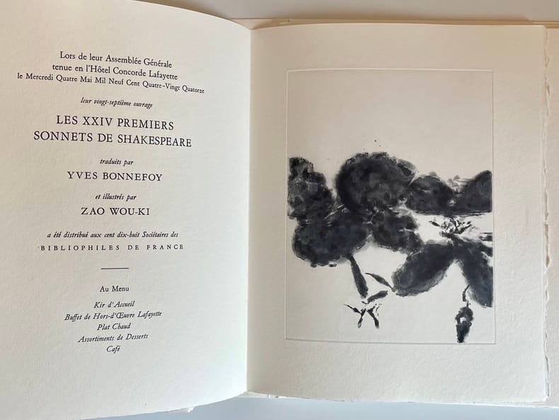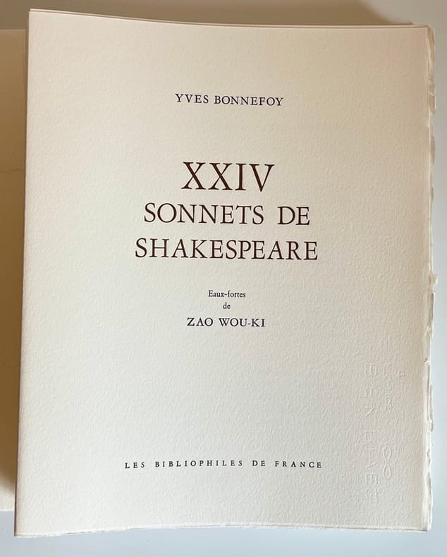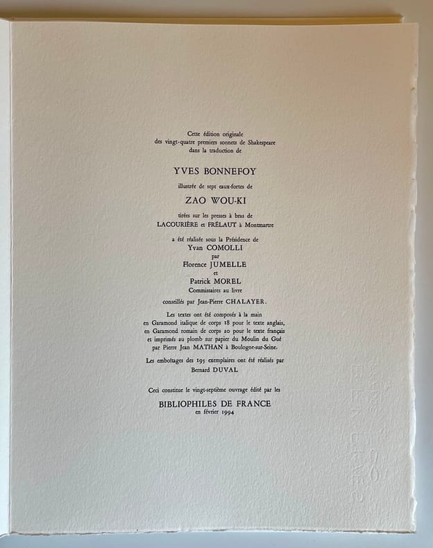 Paris, Les Bibliophiles de France, 1994. In-folio, en feuilles, couverture rempliée, boîte-étui de l’éditeur.Zao Wou-ki, the graphic work, pl. 366 à 372. Édition originale de la traduction d’Yves Bonnefoy des 24 premiers sonnets de Shakespeare.Elle est illustrée de 7 eaux-fortes originales à pleine page de Zao Wou-Ki.Constituant le 27e ouvrage édité par les Bibliophiles de France, elle fut tirée à 195 exemplaires sur papier vélin, signés par l’auteur et l’artiste.Rare exemplaire de chapelle ; non numéroté et ne portant pas la signature de l'auteur et de l'artiste, il était sans doute destiné à l'imprimeur ou l'atelier typographique.Il est enrichi d'une des 30 suites sur chine contrecollé, numérotée 29/30 et signée par Zao Wou-Ki sur chaque gravure ; ces suites étaient réservées aux membres de la Société.Il comprend également le menu, imprimé pour l'assemblée générale des membres, illustré d'une des eaux-fortes de l'ouvrage. Très bel exemplaire.