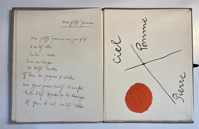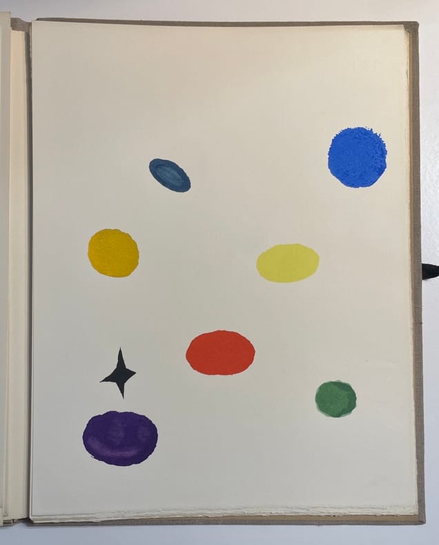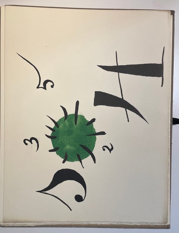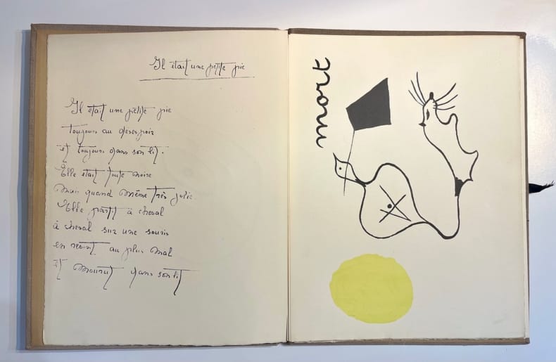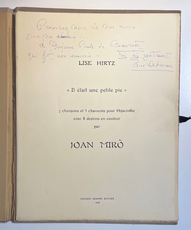 Paris, Éditions Jeanne Bucher, novembre 1928. In-4, 24 feuilles, chemise de toile grise illustrée en noir et vert par Miro, et avec la signature à l’encre noire par l’artiste.Édition originale de ce recueil de 10 chansons (dont 7 pour Hyacinthe, le fils de l'auteure), manuscrites et reproduites en fac similé.Illustré de 8 gouaches de Miro à pleine page, reproduites au pochoir par l'atelier de Jean Saudé, c'est le premier ouvrage illustré de Joan Miro.Jeanne Bucher (1872-1946), fondatrice en 1925 de la Galerie Jeanne Bucher à Paris, est l’une des premières à exposer des artistes d’avant-garde : Picasso, Braque, Klee, Kandinsky, Miro, Vieira da Silva, Nicolas de Staël, etc. Elle fonde en parallèle un atelier d'édition qui de 1925 à 1943, édite environ 28 livres d'artistes mêlant poésie et gravure.Lise Hirtz (1898-1980 - son vrai prénom est Anne-Marie), épouse en décembre 1928 Paul Deharme, pionnier de la radio. Amie intime de Paul Éluard, André Breton, Man Ray, Valentine Hugo, Gisèle Prassinos, Jean Cocteau..., elle devient dans les années 1930 l’une des muses du cercle surréaliste : elle fut "la dame au gant" pour Breton ; la "femme à la bouche qui rêve" pour Éluard ; et Man Ray la portraitura en "Dame de Pique".Tiré à 300 exemplaires non paginés, dont 20 sur Japon et 280 sur Arches. Rare envoi autographe signé sur le titre : "Préservez nous de nos amis pour nos ennemis... à Madame Paule de Beaumont qui fut une ennemie. Très très gentiment Lise Deharme". Paule de Beaumont (1894-1934) — née Paule-Thérèse Dreyfus — épousa le comte Jacques de Beaumont, diplomate et esthète, et fut une figure brillante mais discrète du milieu littéraire et artistique parisien de l’entre-deux-guerres. Avec ironie, Lise Deharme semble détourner la célèbre phrase attribuée à Voltaire : "Préservez-moi de mes amis ; mes ennemis, je m’en charge.", pour adresser cet hommage acide à Paule de Beaumont, qui fut sans doute une délicieuse ennemie. Cet envoi incarne parfaitement l’esprit de Lise Deharme et sa renommée de "Dame de Pique" du surréalisme.Manquent le feuillet de dédicace au compositeur Georges Ouric et celui de justification. Chemise très légèrement salie, un lien déchiré.Cramer, Joan Miró, Les livres illustrés, nº 1.