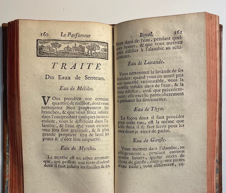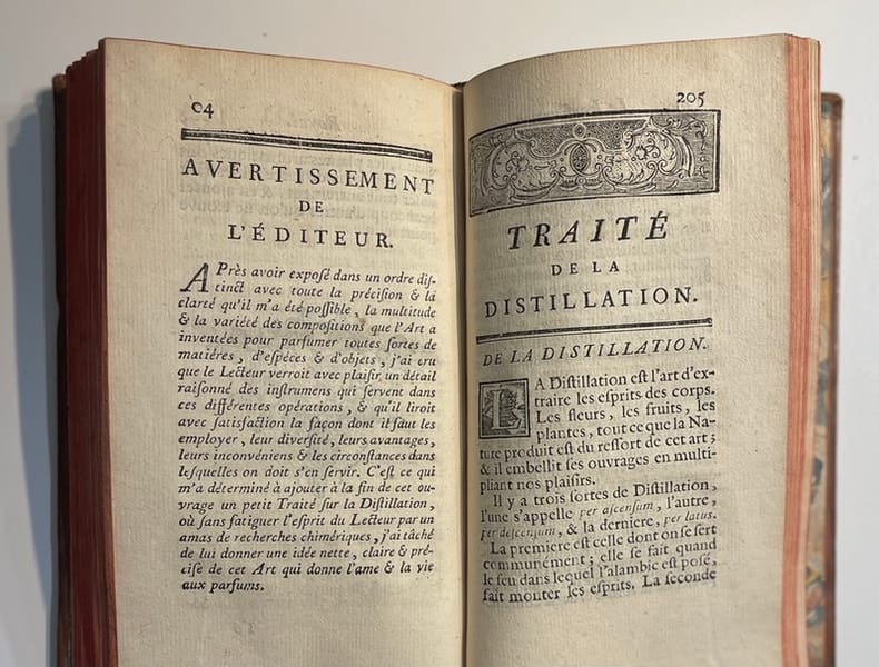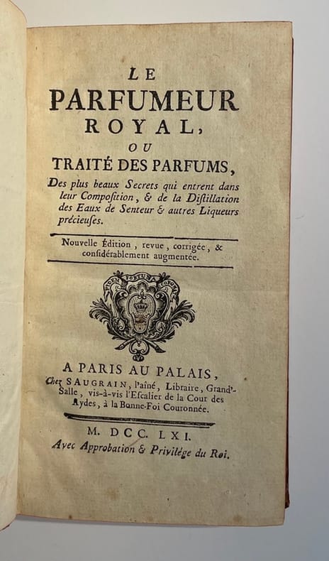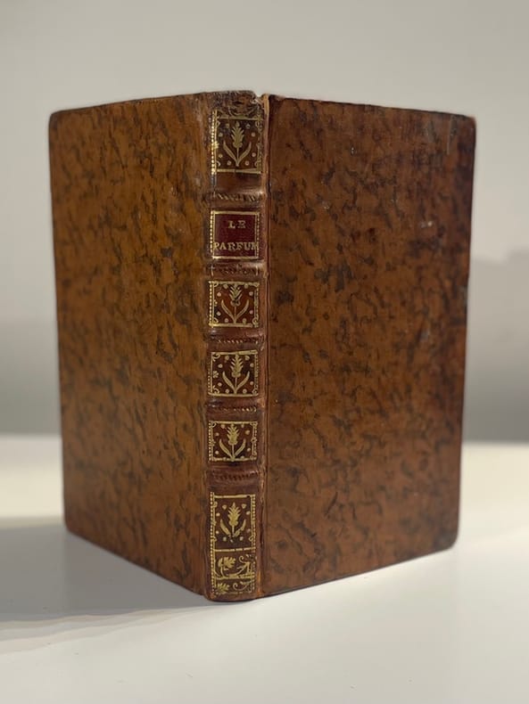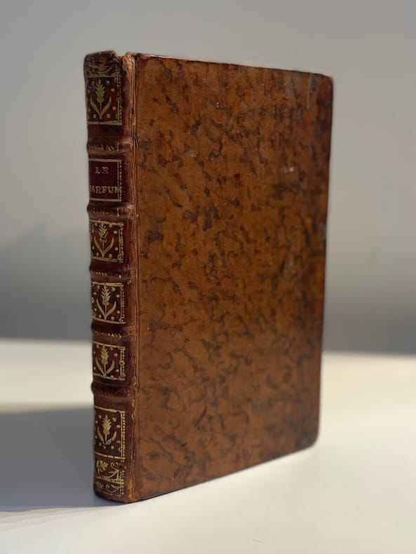Paris, Saugrain l’aîné, 1761. In-12, (1) f. de titre, 242 pp. mal chiffrées 142, (2) ff., veau marbré, dos à nerfs orné, tranches rouges (Reliure de l’époque).Classique de la parfumerie française - néanmoins rare -, ce traité fut composé par Simon Barbe, le plus grand parfumeur du XVIIe siècle qui servit le Dauphin ; paru pour la première fois en 1699, cet ouvrage est un véritable livre de recettes, et donne nombre de consignes techniques à l'intention des gens de métier : gantiers, perruquiers, marchands de liqueurs. Il est divisé en neuf chapitres, détaillant les secrets de la composition des parfums, les différentes sortes de savonnettes, les pommades, les poudres pour les cheveux, les grosses poudres de Violette, les eaux de senteurs, les pastille à brûler, les liqueurs à parfums à la bouche. Et pour cette deuxième édition, "corrigée et largement augmentée" établie par l'imprimeur Claude-Martin Saugrain, un dernier chapitre est consacré à la distillation : alambic, serpentin, bain de vapeur, fumier de marc de raisin...Nouvelle édition, rare, publiée après le nouveau privilège daté du 29 mai 1761. Importante dans l’histoire de la parfumerie, elle parait sans les recettes nouvellement condamnées car utilisant des cosmétiques minéraux et métalliques dangereux. L'approbation signée Guettard, premier médecin du roi, spécifie en effet qu'ont été retranchées « les compositions dans lesquelles il entre de la litarge, du blanc de plond (sic), du sublime corrosif, de l’alun, du nitre ».Bel exemplaire en reliure de l’époque.Ex-libris Kilian Fritsch.Petit manque à la coiffe supérieure.