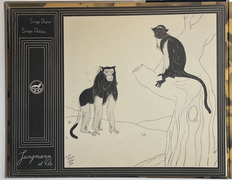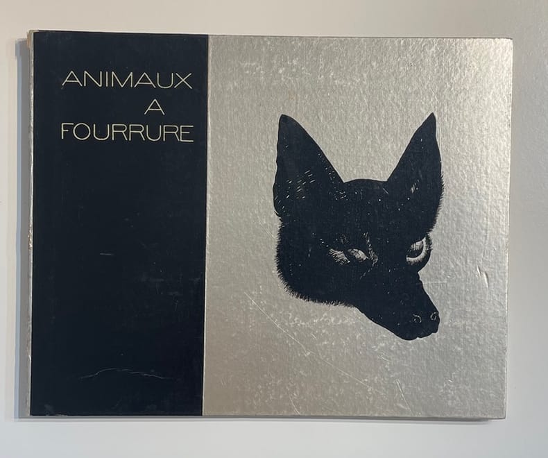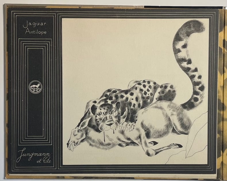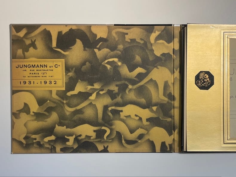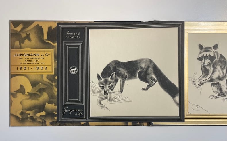 Paris, Jungmann et Cie, 1931. Album in-8 oblong, (2 ff.), 24 planches, en feuilles retenues par un rabat ajouré, et sous chemise éditeur cartonnée noire et argentée, illustrée d’une tête de renard en noir. Prestigieux album de publicité, imprimé par les soins de l’imprimeur-éditeur publiciste Alfred Tolmer, dont les tirages raffinés, ornés de gouaches, de pochoirs, et la typographie moderniste faisaient la réputation. Il fut publié pour l’une des grandes maisons parisiennes spécialisées dans la haute fourrure, "Jungmann et compagnie", pour sa collection 1931-1932. D'un style pleinement Art Déco, il est illustré par Ray Bret-Koch (1902-1996), d'une planche sur double page présentant les différents manteaux proposés par le fabricant, et de 24 planches figurant les animaux à fourrure.Rare exemplaire très bien conservé.Ex-libris Kilian Fritsch.Infimes frottements.