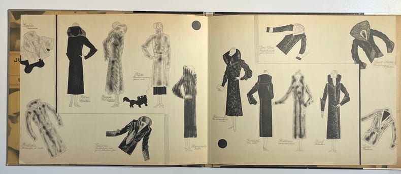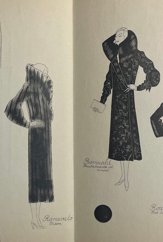 Superbe album réalisé par les Fourrures Jungmann & Cie pour la collection 1931-1932, réunissant une double-planche de présentation des manteaux de la collection et 24 très belles planches en noir et blanc des différents animaux à fourrure. Ray Bret Koch (1902-1996) crée un jeu très graphique sur les noirs et les blancs. De légères usures à la couverture, trace de colle sur la deuxième de couverture et la couverture dorée, rare et bel exemplaire complet.