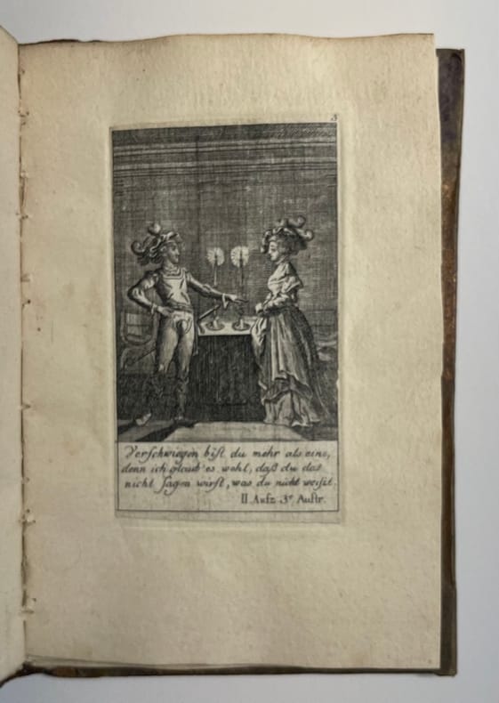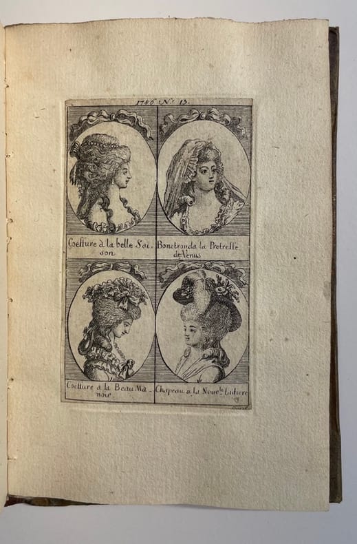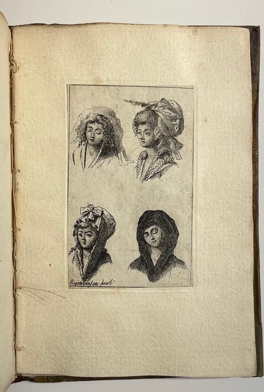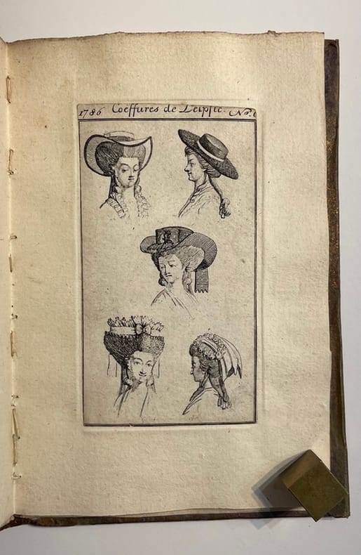 S.l., [1786]. Petit in-12, 18 gravures demi-chagrin marron, plats de papier dominoté, dos lisse muet (Reliure moderne).Ravissant recueil dont les 6 premières gravures, probablement extraites de divers petits almanachs de l’époque et contrecollées sur papier fort, réunissent chacune 4 ou 5 coiffures de la fin du XVIIIe siècle. Suivent 12 vignettes légendées en allemand, illustrant Henri IV de Shakespeare d’après Eschenburg, et sur lesquelles les personnages principaux portent de grands chapeaux à plumes ou casques remarquables.Bon exemplaire en reliure moderne.Ex-libris Kilian Fritsch.