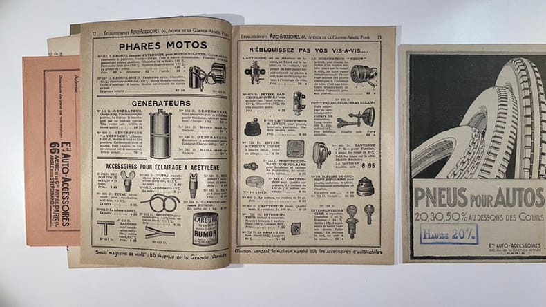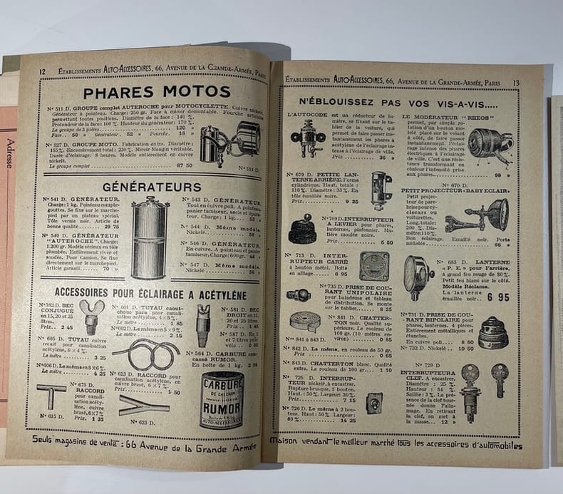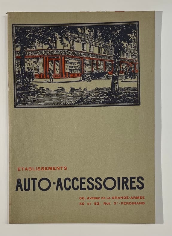 Catalogue général des Établissements Auto-Accessoires. Paris, (vers 1930). In-8 (14 20 cm), 63 pp., agrafé, couverture illustrée d'une vignette représentant la façade du magasin de l’avenue de la Grande-Armée, nombreuses illustrations techniques dans le texte.Petit catalogue abondamment illustré des Établissements Auto-Accessoires, importante maison parisienne d’équipements automobiles située 66, avenue de la Grande-Armée et 50–52, rue Saint-Ferdinand.Réduction du catalogue "Tarif général", il décrit et illustre des burettes, pompes, gaines « Jeavons », ampoules, catines, injecteurs, bidons divers, pièces détachées, produits d’entretien, pneumatiques, outillage, etc. Table des matières in fine.Avec documents annexes (lettre de présentation tapuscrite et bons de commande).