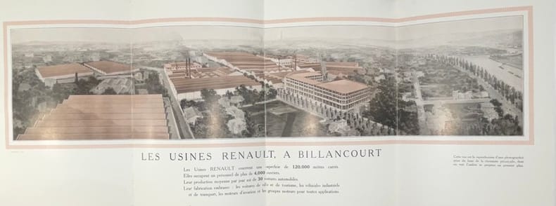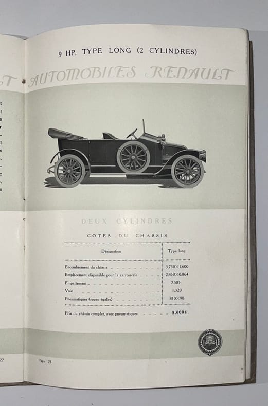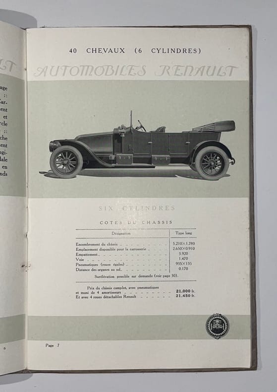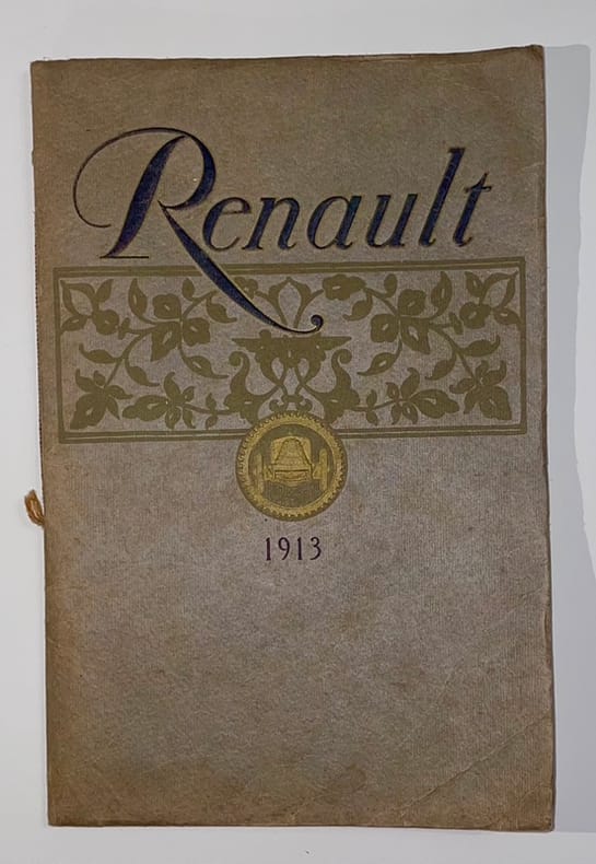 Paris, Galerie d’Exposition, 53 avenue des Champs-Élysées ; Usines et Bureaux, 15 rue Gustave-Sandoz, Billancourt (Seine), 1913. In-8, 36 pp., broché, cordon,couv. imprimée en or et noir.Rare catalogue Renault imprimé par Draeger, avec tarifs, ouvrant sur un panorama dépliant des usines, et décrivant les chassis 1913 (6, 4 et 2 cylindres) : spécifications techniques, cotes, prix, roues détachables, véhicules industriels, moteurs. Illustré de 10 beaux modèles.Dans les années 1913-1914, Renault développa des modèles de luxe et de tourisme, et les catalogues de cette période sont rares.Première garde salie, couv. lég. froissée et tachée.