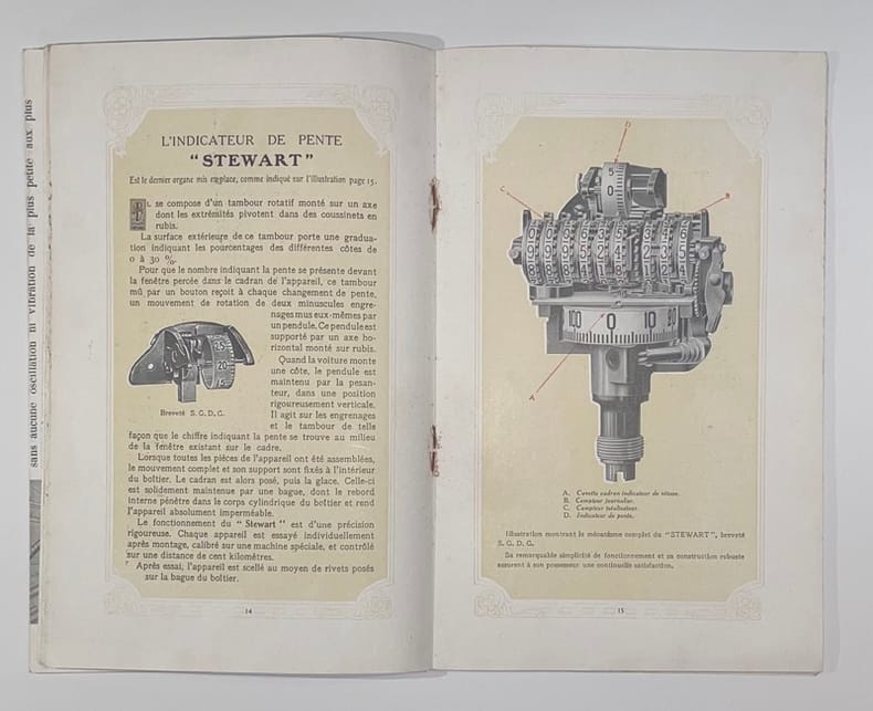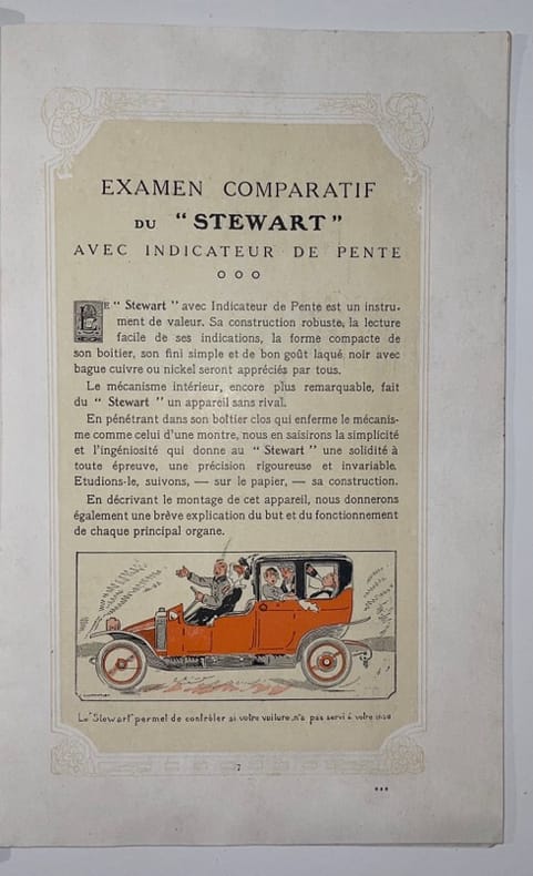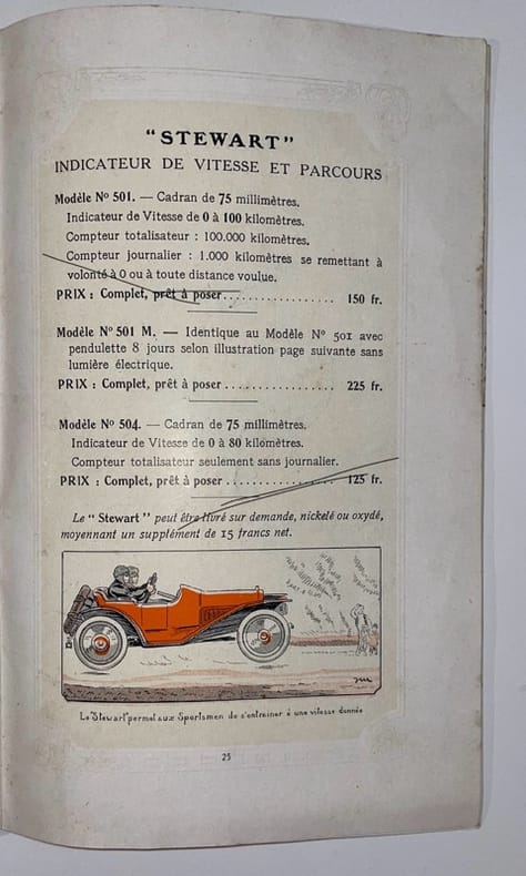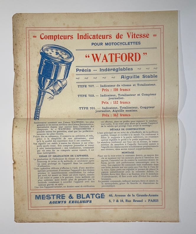 - EYQUEM. Ce que les constructeurs ont choisi. La Bougie "Eyquem". In-16 oblong agrafé. Rare fascicule publicitaire pour les bougies d'allumage Eyquem, listant leurs clients constructeurs.- STEWART. Indicateur de vitesse, parcours, pente. Vers 1915. In-8, 28 pp., agrafé. Rare catalogue publicitaire technique pour les compteurs Stewart, marque américaine distribuée en France ; avec une lettre de présentation tapuscrite, datée 19 janvier 1914, et un feuillet technique, in-4, pour un indicateur Stewart pour motocyclettes.- WATFORD. Compteurs indicateurs de vitesse pour motocyclettes. Un feuillet technique, in-4.