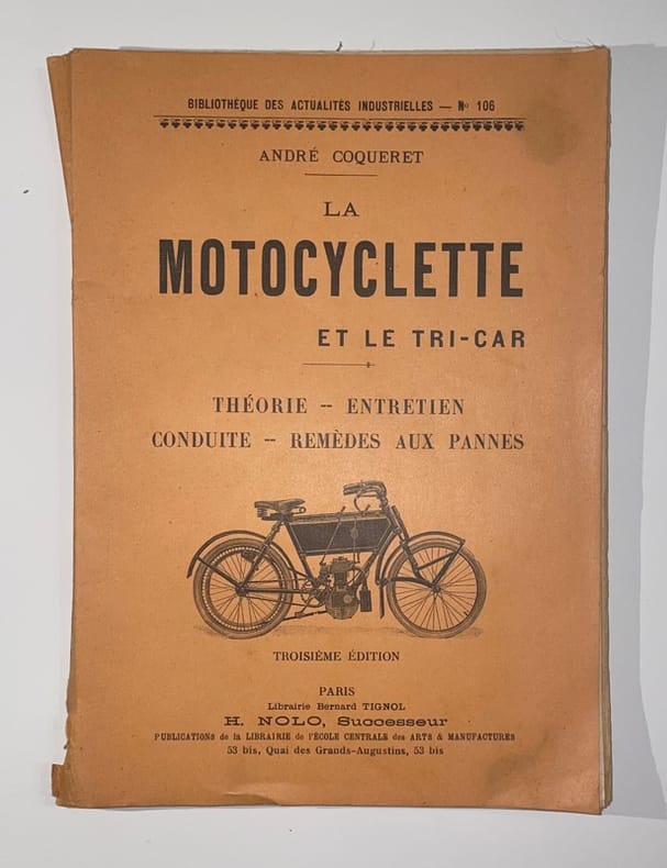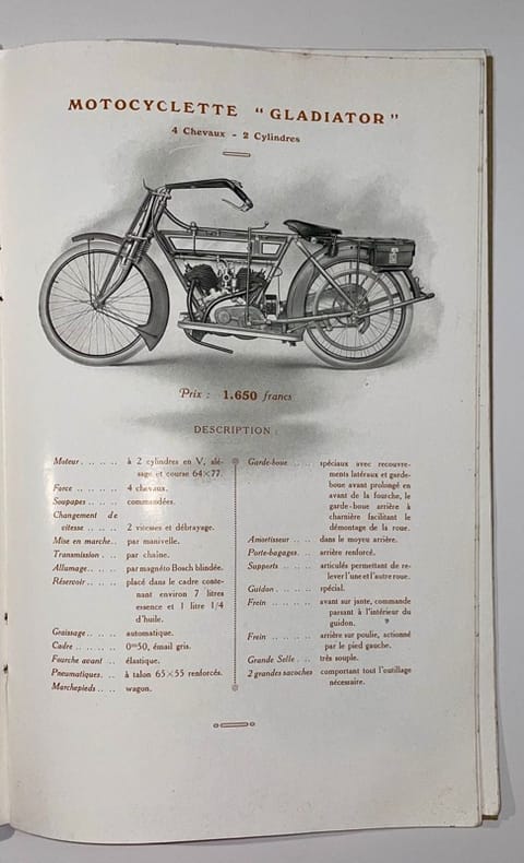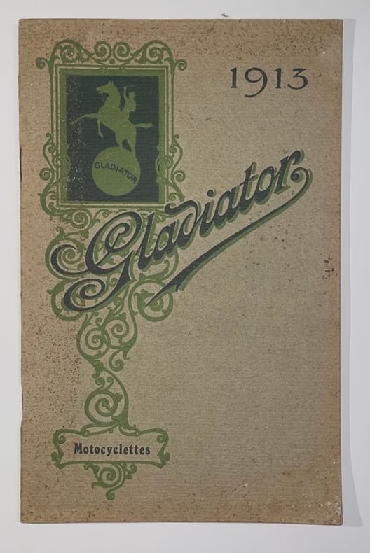 Pré-Saint-Gervais. In-8, agrafé, 12 pp., avec des modèles de side-car. Couv. tachée.Rare catalogue de motocyclettes d’avant-guerre de la marque française Gladiator, ancêtre du groupe Automoto puis Peugeot.Joint : COQUERET (André). La Motocyclette et le tri-car. Paris, Librairie Bernard Tignol, H. Nolo successeur, (vers 1920). In-8, débroché, manques de papier au dos.Théorie, entretien, conduite, remèdes aux pannes ; 3e édition, "Bibliothèque des actualités industrielles, n° 106" ; sans le modèle démontable en couleurs.