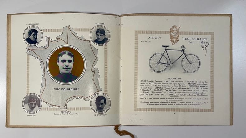Courbevoie 1913. In-8, cordon, 24 pp.Rare catalogue publicitaire de la marque Alcyon, l’une des maisons françaises les plus réputées de cycles, motocyclettes et accessoiristes avant la Première Guerre mondiale. Il présente des vélocipèdes, quelques motocyclettes, et la voiture "Tour de France", avec tarifs. Alcyon est également réputé pour son implication dans les compétitions sportives (Tour de France, championnats moto), et la page 8 présente les coureurs de cette marque, dont Defraye, gagnant du tour de France 1912.Couv. tachée, pliée ; traces de cachet sur le première de couv. et le titre.