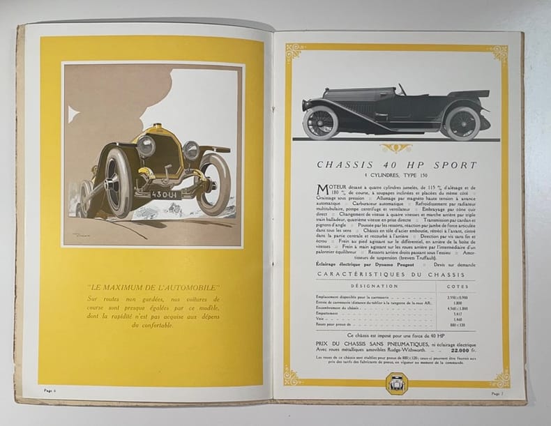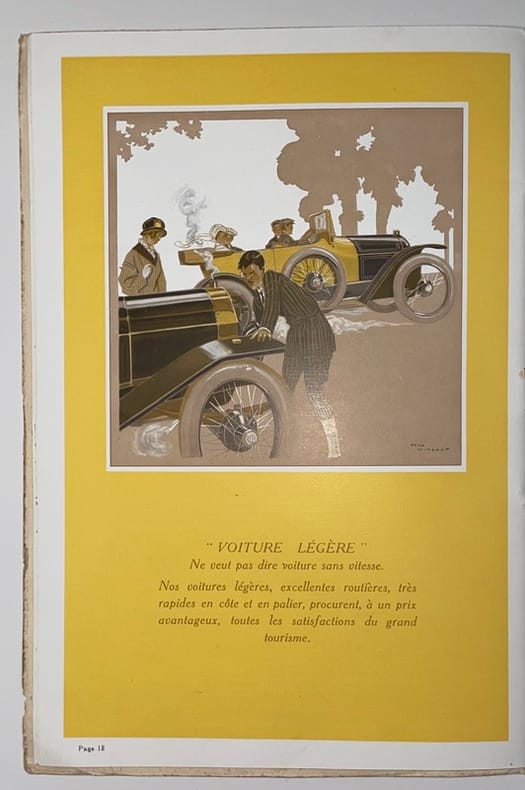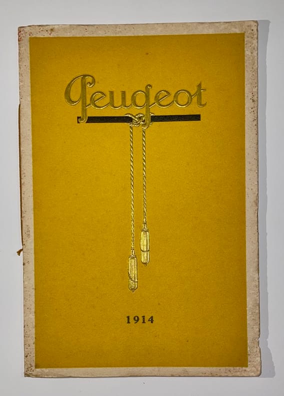 1914. In-8, 24 pp., agrafé, couv. illustrée imprimé en relief motif des cordes et contrepoid, en or sur fond jaune.Joli et rare catalogue Peugeot imprimé par Draeger, présentant les modèles 10 HP (Légère), 14 HP (Coloniaux), 18 HP (Sport, Long, Coloniaux), 40 HP (Sport, Extra-Long) et la Voiturette Bébé-Peugeot. Illustrations de René Vincent.Piqûres sur les couvertures.