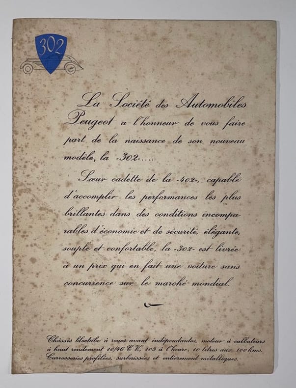 Annonce officielle de lancement de la Peugeot 302. Un f. in-4 plié, vers 1936.Rare communiqué commercial à la manière d'un faire-part sur le premier plat : "La Société des Automobiles Peugeot a l’honneur de vous faire part de la naissance de son nouveau modèle, la “302”..." L'intérieur, illustré en couleurs, est d'un style plus contemporain. Non pas destiné au grand public mais envoyé aux agents et aux concessionnaires, ce prospectus était tiré à peu d'exemplaires. La Peugeot 302, introduite au salon de Paris 1936, est commercialisée fin 1936 – 1938.Rousseurs et petite déchirure sans manque.
