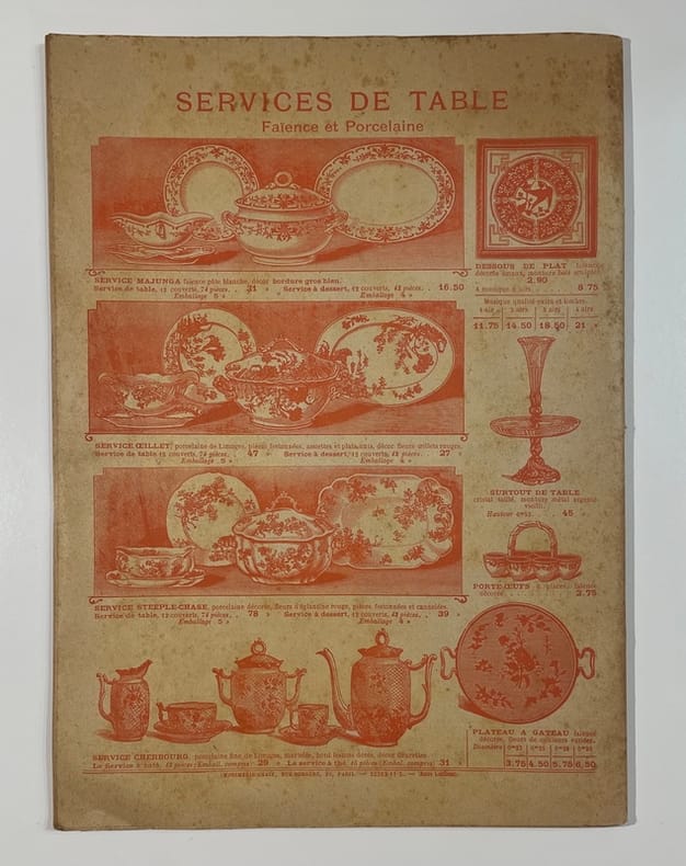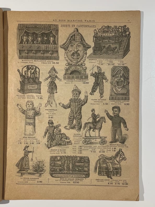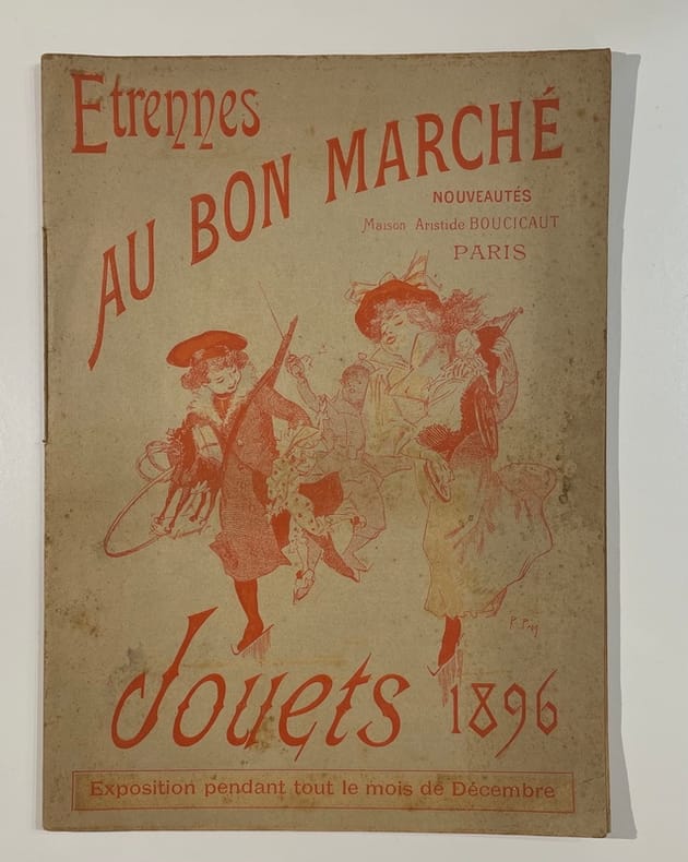 In-8, 64 pp., agrafé, couv. illustrée imprimée en rouge.Catalogue des nouveautés de la Maison fondée par Aristide Boucicaut à Paris : ménages de poupées, jouets, papeterie, voyage, bijoux, orfèvrerie, meubles de luxe, lingerie fine, fourruresCouverture tachée.