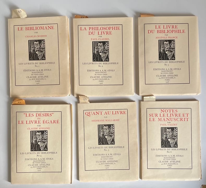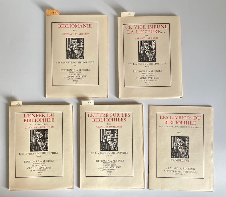 Maastricht, A.A.M. Stols ; Paris, Claude Aveline, 1926. 10 vol. in-12, brochés, sous étui. Édition originale et collection complète. Tirage limité à 350 exemplaires, un des 300 sur vélin Brédero (seul tirage après 10 Japon et 40 Hollande), n° 45. Complet du livret de souscription.