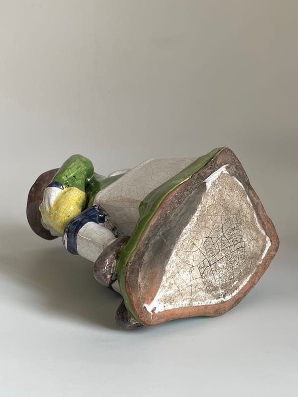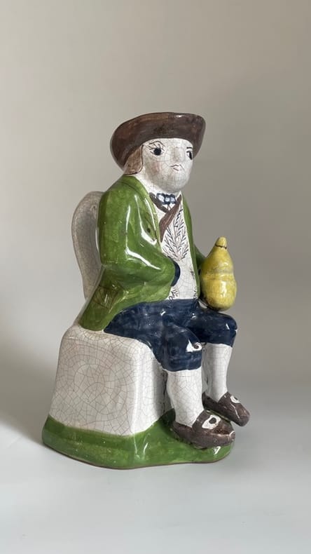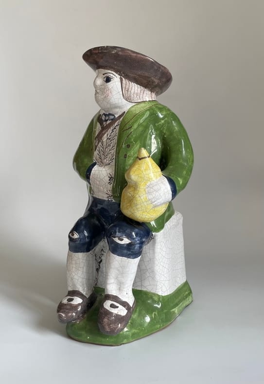 Vers 1850-1880. Env. 27x13x15 cm.Pichet anthropomorphe, en faïence émaillée, avec un joli craquelé, représentant un personnage assis, la main gauche tenant une gourde jaune, et la main droite dans son veston. Le modèle, naïf et d'une belle polychromie, porte un costume folklorique assez détaillé.Inspiré des fameux "Jacquot", ce type est caractéristique de la production populaire française (Nord, Est, Ouest), de la seconde moitié du XIX siècle.État sain, pas d'éclats.
