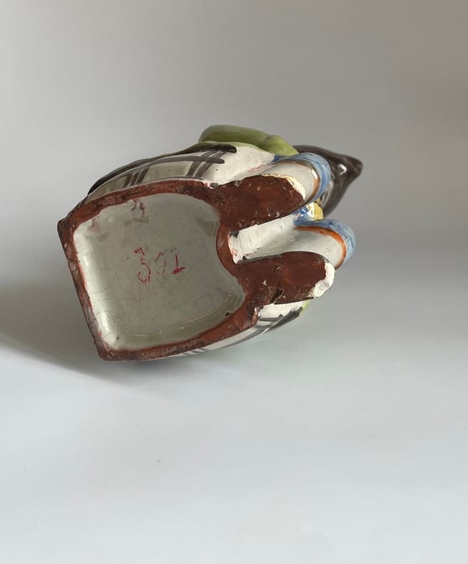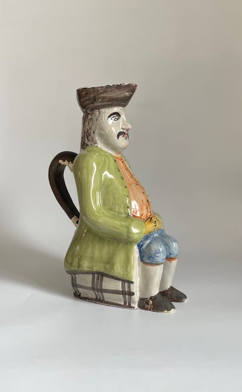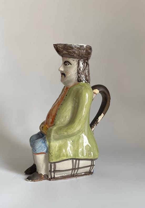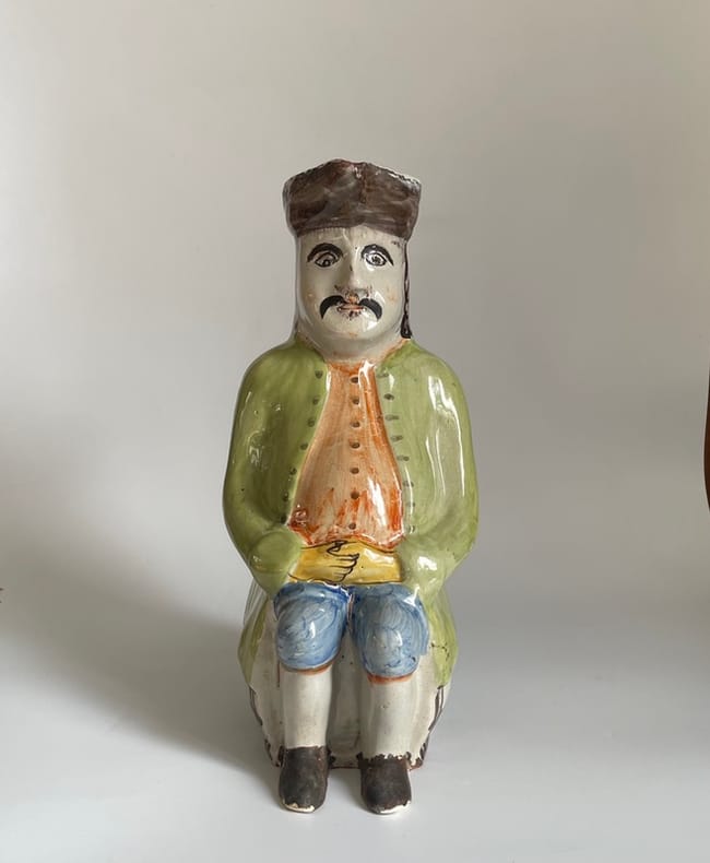 Vers 1860-1880. Env. 27x13x19 cm.Pichet anthropomorphe populaire, en faïence émaillée, représentant un personnage moustachu, les mains croisées, assis sur un tonneau, au dos duquel est inscrit un nom de personnage et une date commémorative : "Pierre. Pan. 1835".Modèle folklorique authentique, d'une belle polychromie, inspiré des fameux "Jacquot", sans doute issu d'une production populaire française du Nord ou de l'Ouest, de la seconde moitié du XIX siècle.Petits éclats, usure d'émail avec manques à l'anse.