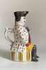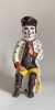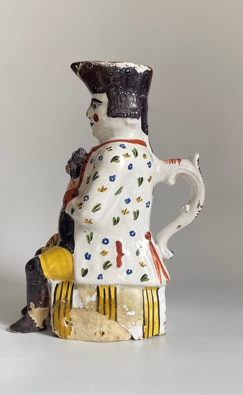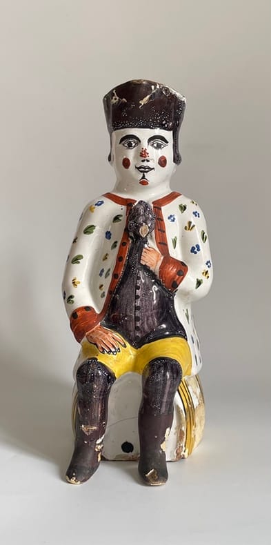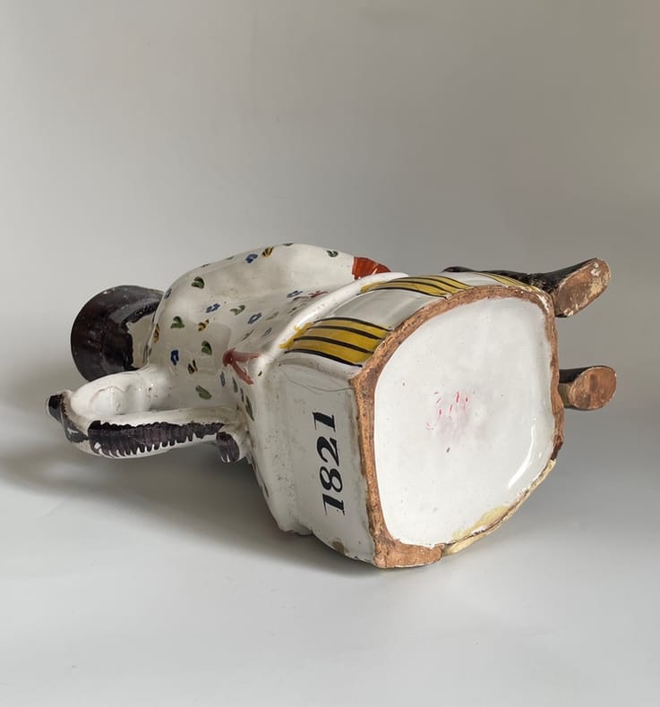 Vers 1860-1880. Env. 29x13x19 cm.Pichet anthropomorphe en faïence polychrome, représentant un soldat napoléonien buveur, assis sur un tonneau, tenant une grappe de raisin en relief, dans un registre bachique populaire. Il est coiffé d’un bicorne noir, au visage naïf à joues rouges, porte une veste blanche à semis de fleurettes polychromes et culotte jaune. Au dos, anse en forme de poisson stylisé.La base porte l’inscription « 1821 », sans doute une date commémorative évoquant la mort de Napoléon Ier.Égrenures et usures d’usage aux reliefs et arêtes.Manques d’émail localisés (chapeau, base, anse).Petit trou ancien à la base.