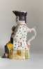 Vers 1880-1900. Env. 27x13x13 cm.Pichet anthropomorphe populaire, en faïence émaillée, représentant un soldat napoléonien, portant un bicorne orné de la cocarde, le visage rougi, assis sur un tonneau avec bouteille et gobelet dans les mains.Modèle militaire populaire, d'un beau décor coloré, de la fin du XIX siècle.Petits éclats, usures d'émail, manque l'anse.