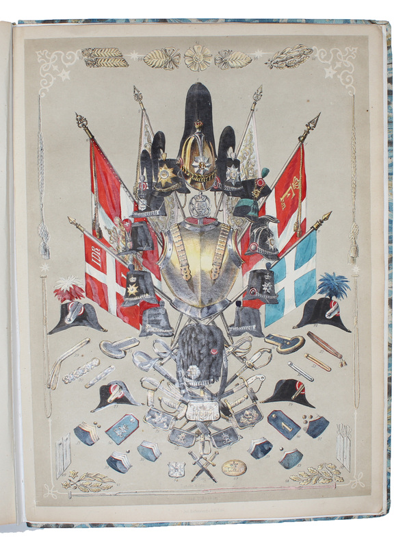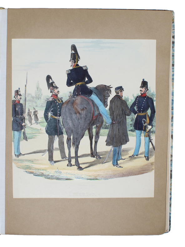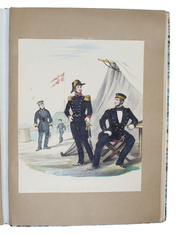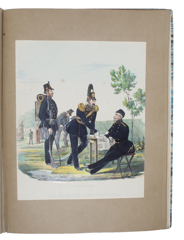 Kbhvn., Jul. Hoffenbergs Tryk og Forlag, (1858). Lille folio. Senere marmoreret papbd. med stor skindtitel med guldtryk på forperm. Uden titel og de 6 tekstblade, men med samtlige 26 plancher, hvor de 20 viser uniformerne og de 6 tillgsplancher viser detaljerne i uniformernes udstyr. Uniformsplancherne opsat på karton, som altid. Plancherne er farvelitograferede og håndkolorerede.
