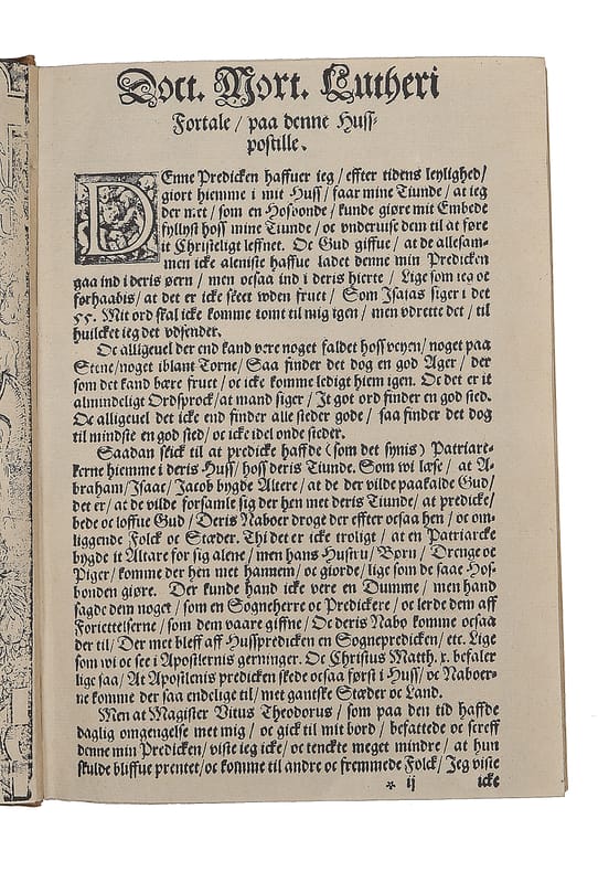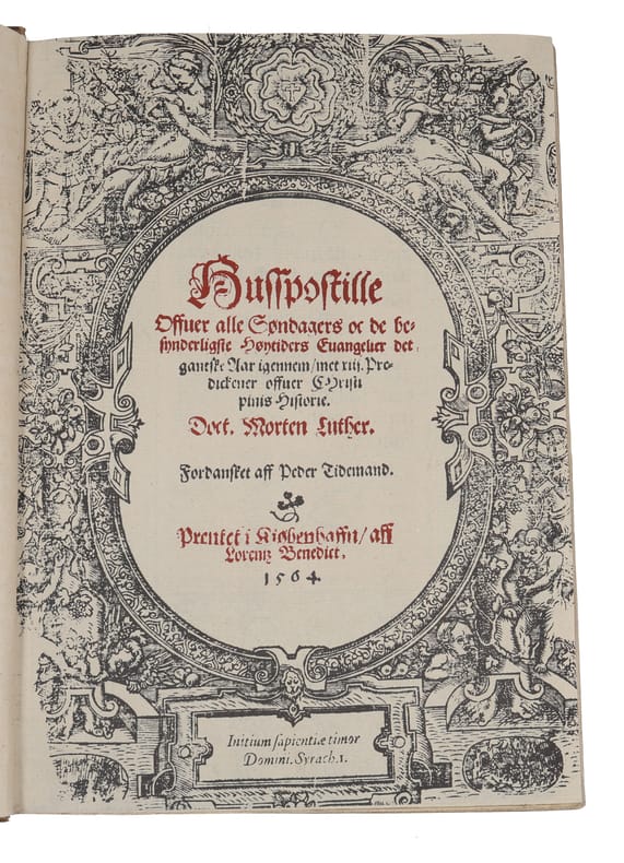 Første danske udgave af Luthers Postil og af største sjældenhed i komplet stand. Kun ganske få bevarede på private hænder. De fleste eksemplarer i de offentlige biblioteker er ukomplette (Lauritz Nielsen anfører kun 7 komplette eksemplarer). En af de mest betydningsfulde bøger fra Benedichts trykpresse, og det største i omfang.Extremely scarce first Dansih edition of Luther's ""Hauspostille"" with only af few copies still on private hands.Thesaurus I, 104. - Birkelund, 24. - Lauritz Nielsen, 1084. - Paulli, 20.