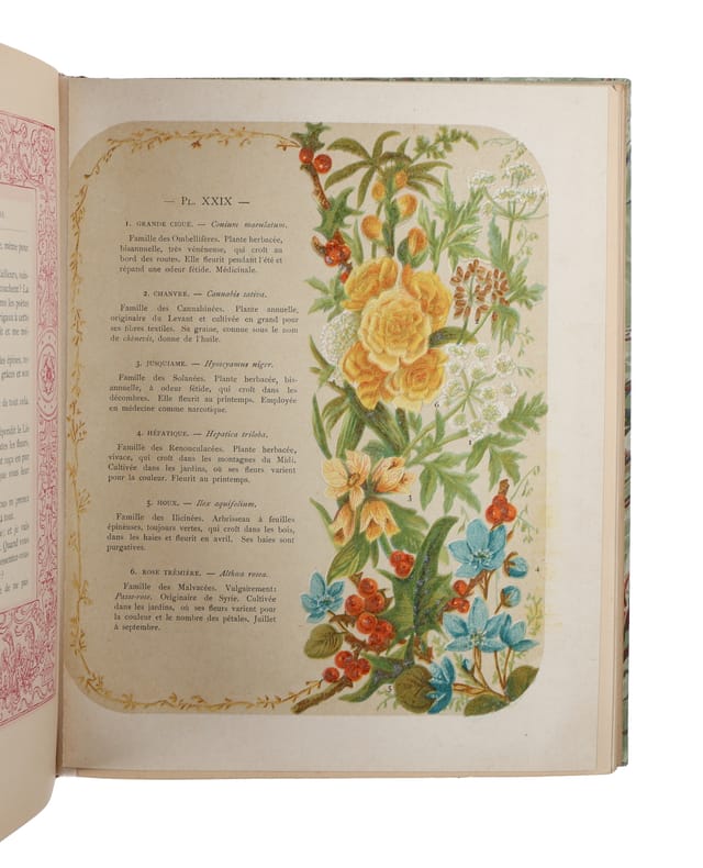 Paris, J. Rotschild, 1884. Small 4to. Fine later marbled boards. Gilt titlelabel in leather on back. Uncut. 104 pp. and 64 chromolithographed plates with text.