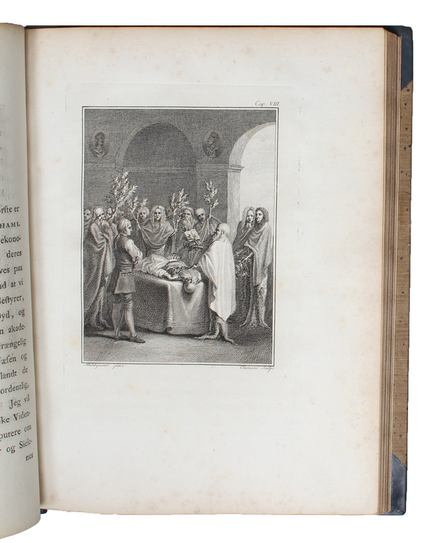 Kbh., 1789. 4to. Samt. slidt hldrbd. m. rig rygforgyldn. False slidte og delvist revnede. Kapitæler professionelt restaurerede. Titelbl. lidt nusset, indimellem en smule brunplettet. P. 228 ubeskåret og foldet, bevarende samt. marginale noter, bestående af en engelsk oversættelse, p. 276 ligeledes m. marginale noter på engelsk i samme hånd, den ubeskårne side m. understregninger i teksten. På skrivepapir. M. alle 16 kobberst. plancher af Clemens, de 15 efter Abildgaard og Niels Klim som drabant efter Juel.